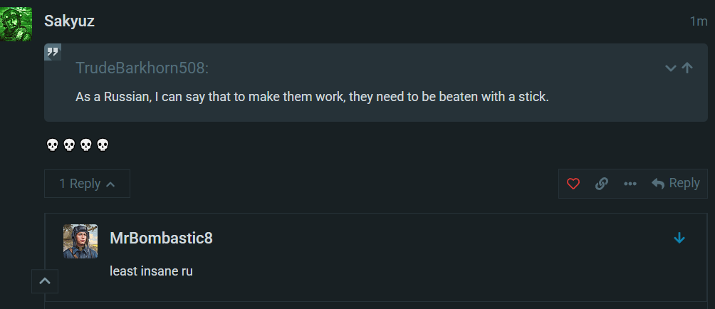 Вообще обосрандер надо запретить как рекламу чвк. Кто главный герой игры? Игрок. Что он делает? Управляет экипажами техники, которые не принадлежат никаким странам, то есть являются наемниками. Если хотите возразить, типа ХРЮЮЮЮЮЮЮЮЮЮ ВЕТКИ ПАНАЦИЯМ ПАНАЦИЯМ, то как же в АРБ и в ТРБ иногда одна и та же нация воюет сама с собой? Это кстати еще и объясняет почему техника игроку достается не эталонного качества, а его из говна и палок. Потому что он покупает ее в свой парк со складов стран уже списанной и приводит в порядок, зарабатывая на вылазках своей чвк в бои за "серебрянные львы", которые на деле скорее всего являются аналогом крипты. Это еще и объясняет бесконечность экипажей и вечность войны в игре. Наемников бесконечно, их потери никто не считает, семей и близких у людей удачи нет, так как они аналог проститутки по сути своей. Вот и задумайся анон, какую корпорацию ты поддерживаешь и куда она зазывает фентаниловых и стекломойных ботов.