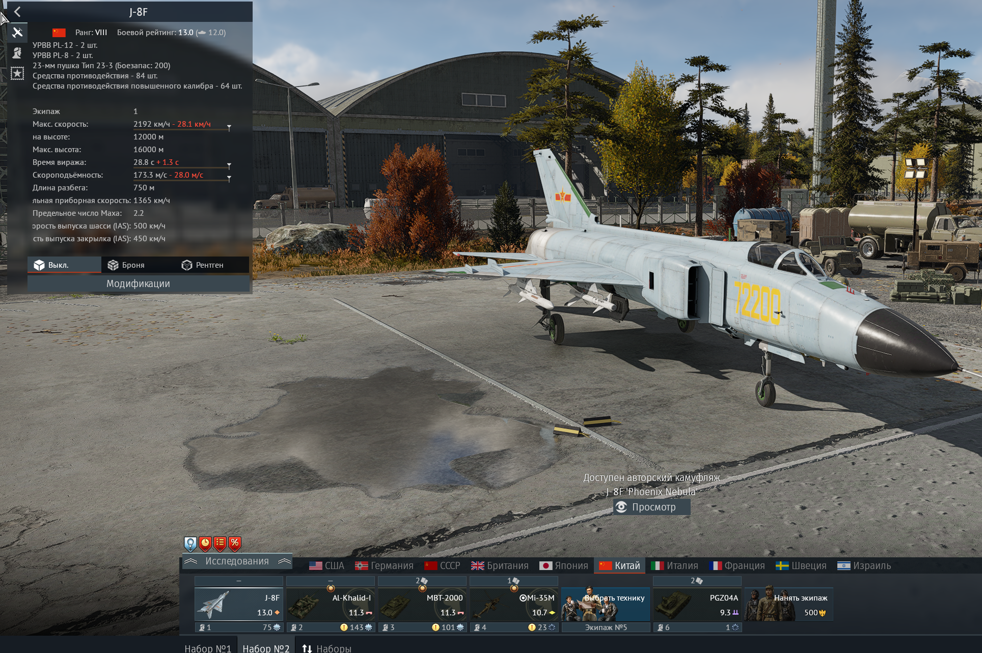 Миссия закончена. J-8F - если бы не Факуры, я бы орал что это пиздец. Но у нас есть Жирафы на 13.0, так что пускай и он будет на 13.0 Авионика у него от +14.0. И она пиздец решает по качеству. СПО что видит всю хуйню, радар что видит всю хуйню, НСЦ, разве только нет БКО, но БКО и не нужно. 72 пуска контрмер. inb4 там же 144, да но они пускаются по 2 так как не крупные. Вооружение у него так же от +14.0 по качеству. Pl-8 нахуй не нужно, ибо нет защиты от ЛТЦ. ЛТХ вот от 13.0. И количество вооружения тоже от 13.0.