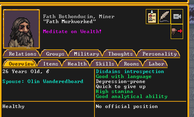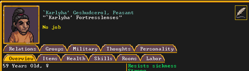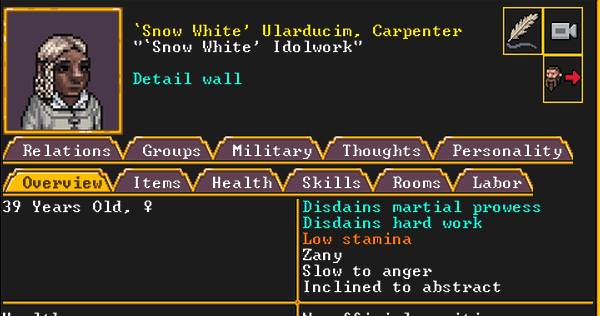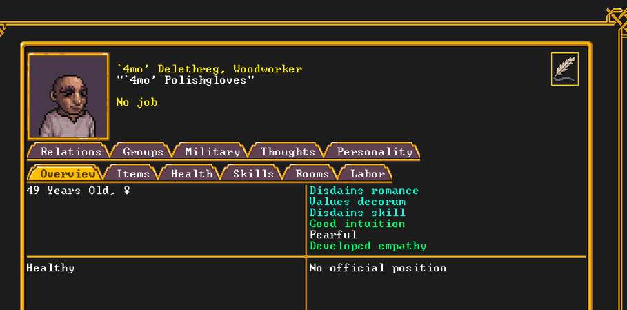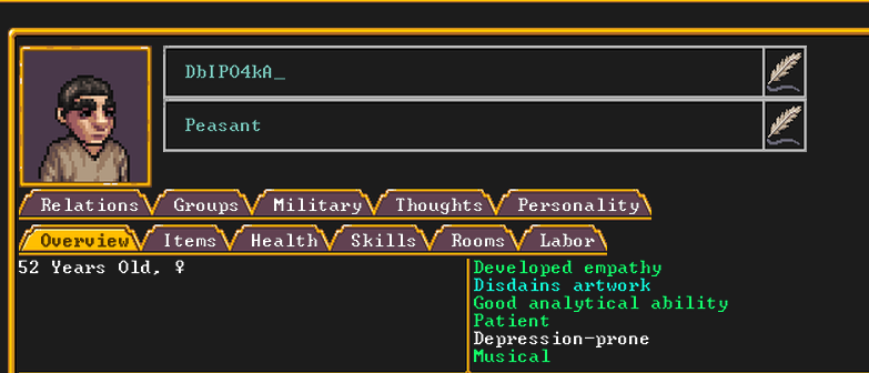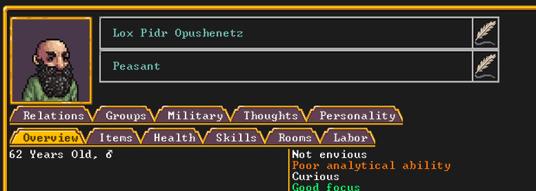 Меня наоборот дико раздражает, что 6 из 7 стартовых дворфов это, как правило, умственно отсталые, деформированные, лишнехромосомные, рахитные дистрофики с астмой и тотальной амнезией, которые за семьдесят лет существования не научились вообще НИЧЕМУ и родились прямиком из очка Армока, минуя всю эту муторную хуйню с сексом и родами. Приходится десятки раз рероллить, чтобы получить хотя бы лидера с минимальными навыками социализации, врача с парой рабочих рук, растущих из плечей, и командира стражи, который умееть разговаривать (а не мычать, как остальное стадо дебилов) и не проиграет битву кролику ввиду полного отсутствия физических характеристик.