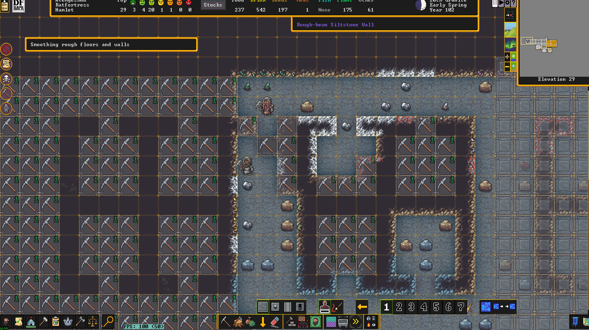 Как вы вообще строите крепость? Срываете подчистую уровень за уровнем, и уже потом там ставите стены под свои нужды? Дворфы не будут валиться от голода за станками в шахте, если у них всё время будет висеть приказ копать?