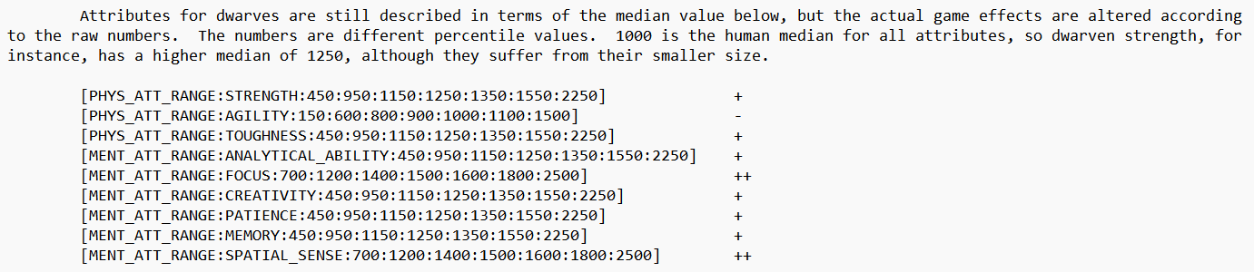 >>50639728 Идешь в data\vanilla\vanilla_creatures\objects\ и открываешь в текстовом редакторе creature_standard.txt. Там можно увидеть пикрел. 1250 - среднее (точнее медиана); если у дварфа сила 1350 или больше, то это у него отображается как большая сила.