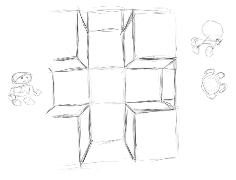 Глядите какой лабиринт разметил. Основной кориидор в начале будет заполнен различными ловушками, а в дальней квадратной комнате будет сидеть огненный имп в клетке или что-то в этом духе, дальше в первой прямоугольной комнате с каналами будет пол из раздвигающихся мостов, активируемых нажимной плитой, с ямой на другой уровень лабиринта, в клетчатой комнате будут расположены боевые звери, ямы в которые будут падать нападающие при уклонении будут вести в отдельную секцию второго уровня лабиринта, а комнатка перед ней будет дистанционно открываться с помощью опускаемого моста и выпускать ещё больше агрессивных зверей, но в этот раз сзади нападающих, зажимая их сдвух сторон, далее виден только узкий путь с выдвигающимися шипами из пола и с глубокой ямой вдоль всего пути и поворотом налево на по ту сторону, добравшись до туда, становится виден вход в финальный отрезок лабиринта, но нажимная плита в корридоре закрывает его прямо перед носом у захватчиков, однако лязг механизмов указывает, что что-то открылось в другой части лабиринта неподалёку и несчастным придётся повернуть обратно, и снова идти по уступу с шипами, сразу за которым опустившаяся стена проявила путь внутрь крепости.