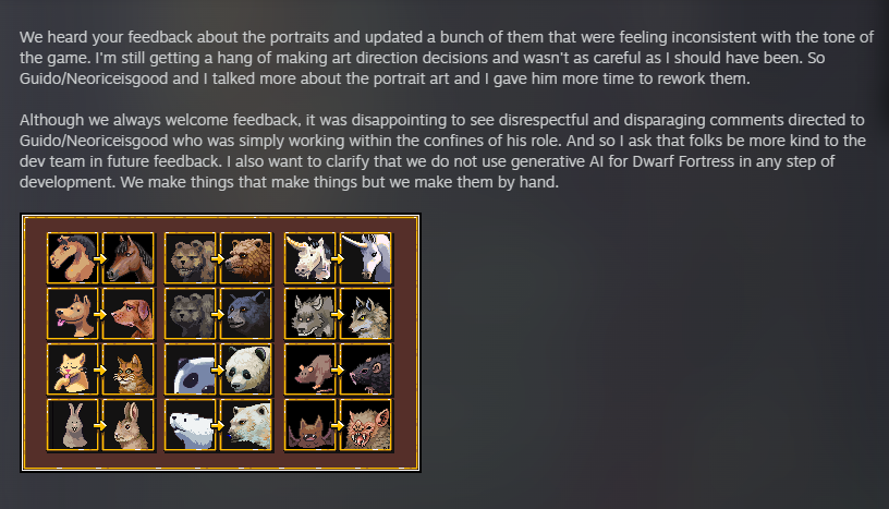 Обновка. Продолжают там чегот доделывать для осад, скоро будут осадные колдуны. Пообещали вернуть старое управление, пока без сроков. Ну если хотя бы склад можно будет разметить парой кнопок без мыши, то уже заебись. Художники сделали портреты всем обычным существам (350 рож). Нахуя. Прост, деньги сосут.