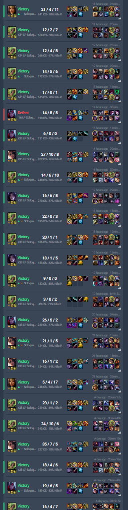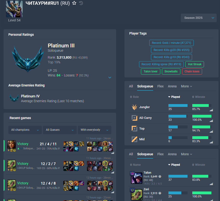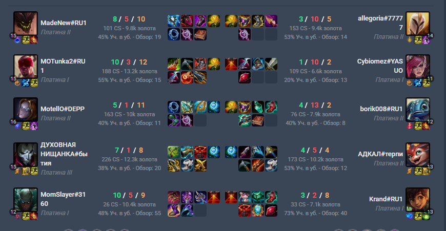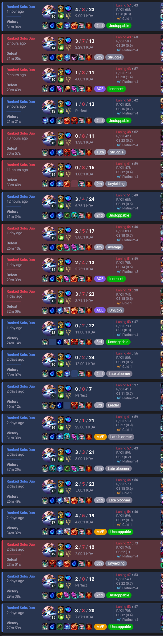 >>50288629 А я иногда ради интереса наблюдаю за акками подобных фидеров. Вот недавно с этим попался https://op.gg/lol/summoners/euw/Gridaher-8513 несколько дней назад, охуительные КДА у него и игры, да? Это хуйло, кстати, зачем-то меня в друзья пыталось добавить - нахуя они это делают?