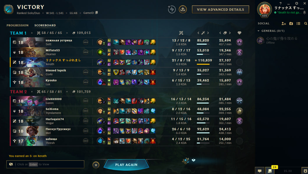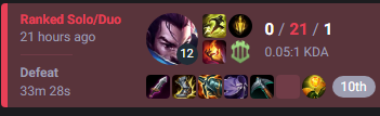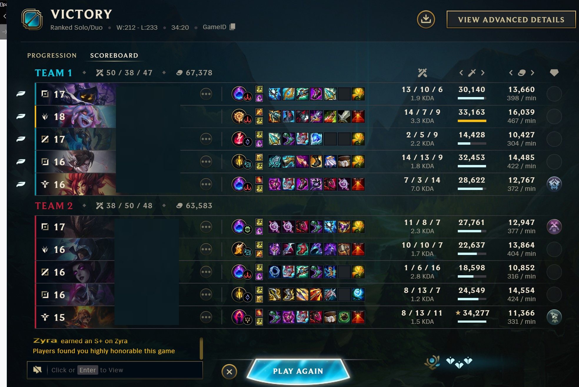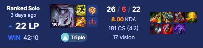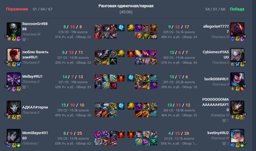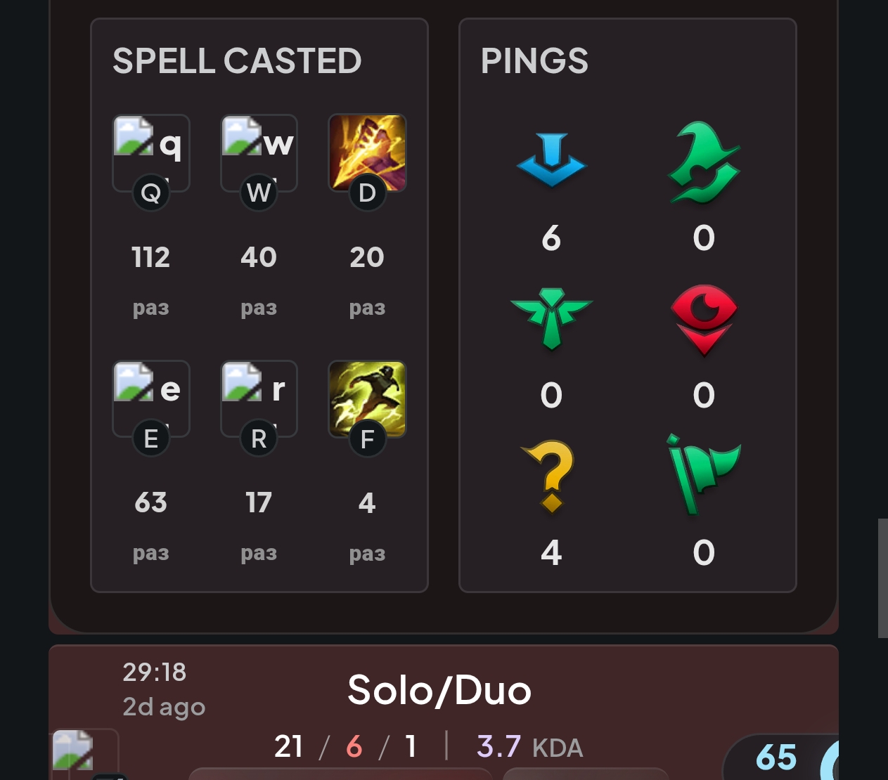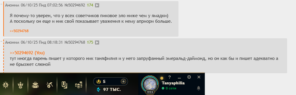 Две недели был оффлайн, а потом появился на одну игру в ранкеде, чтобы сделать 0/1 и уйти афк. Неделю спустя ни одной игры больше не сыграл. И вот такие СТРАННЫЕ игроки появляются каждый раз, когда у меня серия побед и/или винрейт в последних играх около 70%. В это время ритопидор в твиттере пишет как они заботятся о competitive integrity