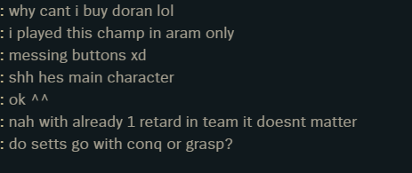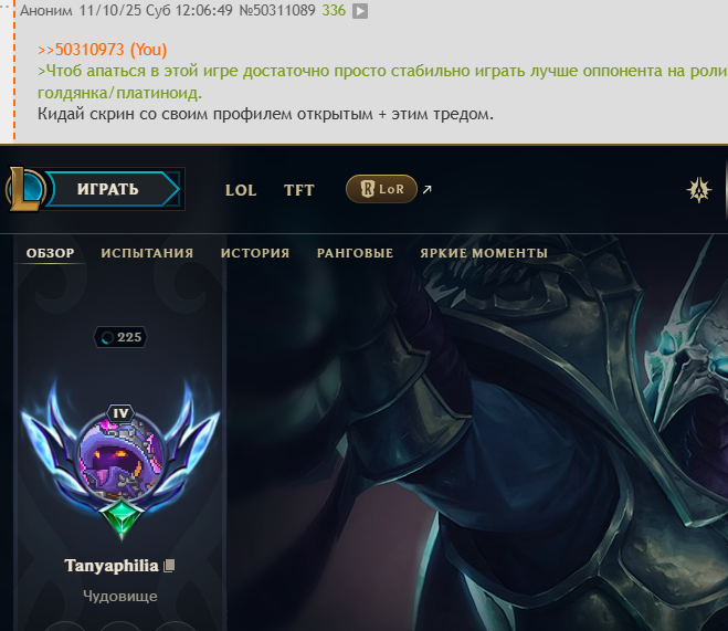Вот последняя игра - я перефармил Дариуса. Это был изи вин. Просто изи вин. Я один мог вынести пятерых. Всё что нужно было это варвику потанчить еблом. Всё. Но нет, он включил главного героя того что отписывался в прошлых тредах. И заруинил игру. Всю игру отыграл соло, на всех обиделся. Его просили ходить вместе, его просили помочь на бароне, на драконе, но он тупо прыгал один в толпу и отлетал по кд. Ну и смысл от таких игр. Впизду эти дрочильни у меня ещё елдер ринг не пройдён.