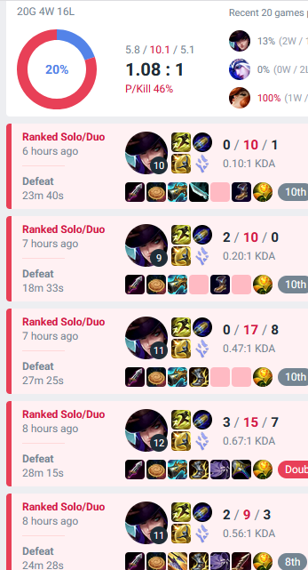 Как же грустно когда заходишь на любимого чемпика, выдаёшь урона больше чем вся тима вместе взятая, но всё равно проигрываешь и так каждый раз. Приходится играть только метой :8