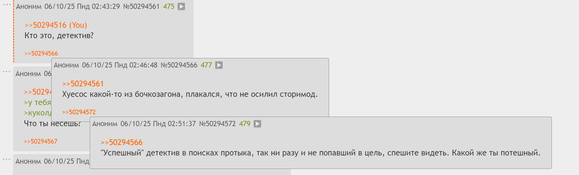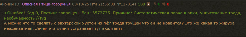 Ебанаты целый день кормили залетуху, которая бегает по разделам с рваной сракой в поисках повесточки, еще и требовали аргументы вместо репортов хех. Тредиус срочно нуждается в экстерминатусе.