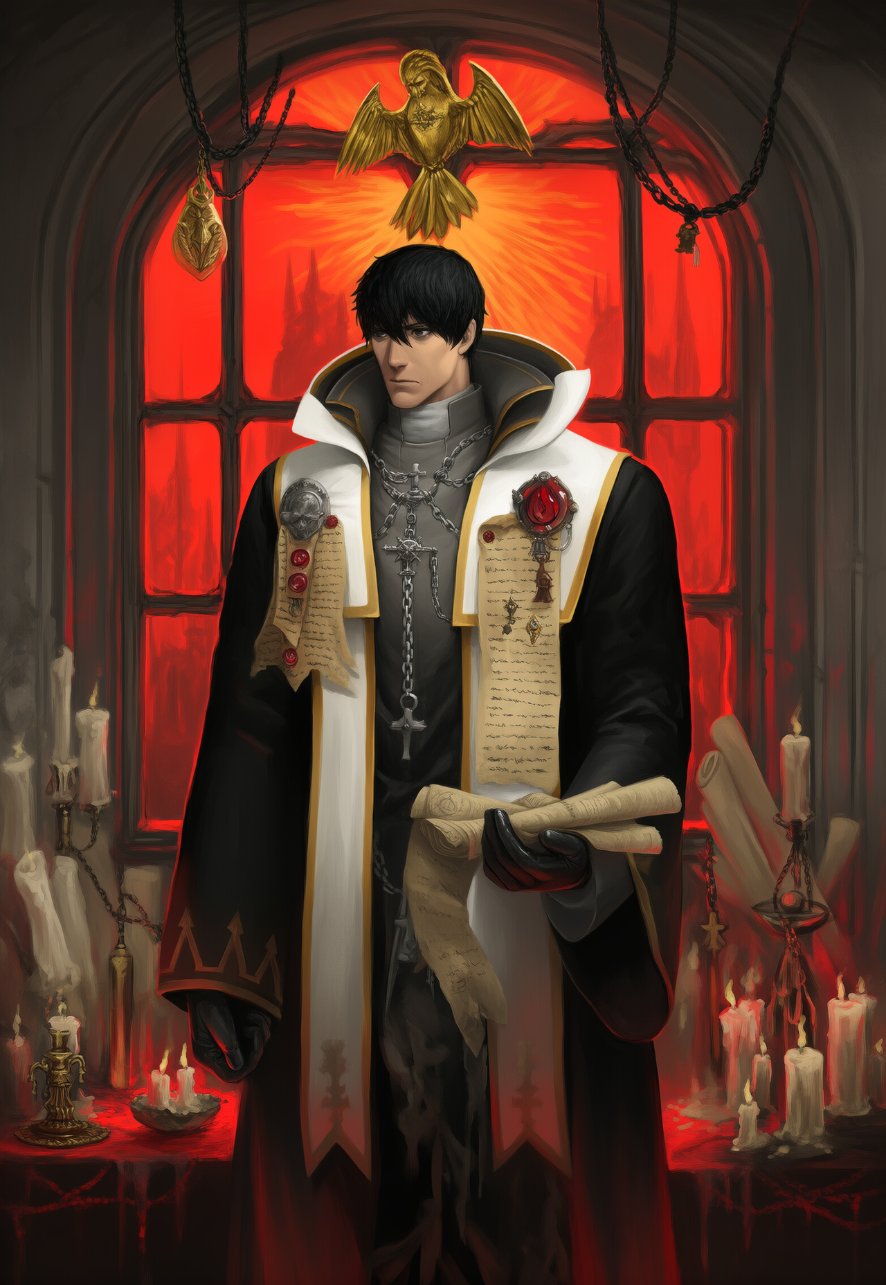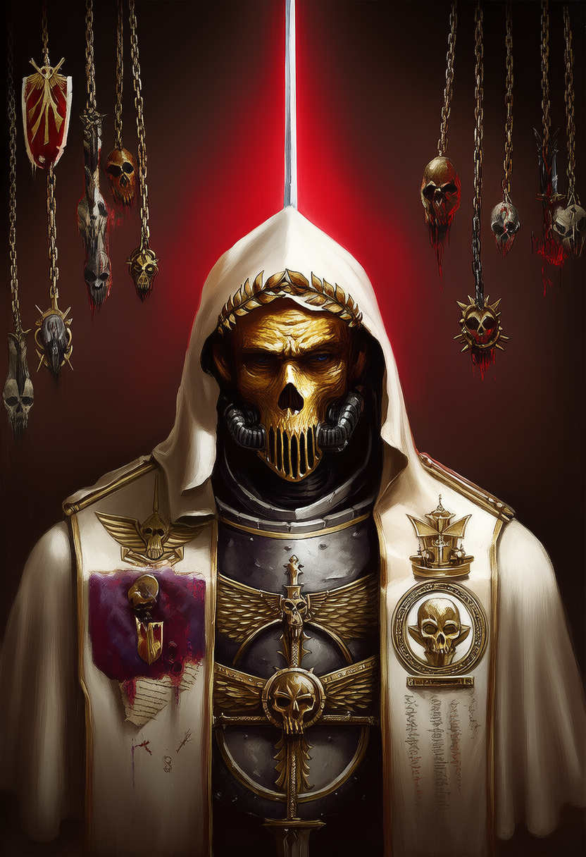 "A grimdark gothic portrait of a Ministorum priest from Warhammer 40k, wearing ornate white and gold ecclesiarchal robes, purity seals, parchment scrolls, golden aquila, gothic relics hanging from chains, burning incense, stern and fanatical expression, cinematic chiaroscuro lighting, painterly oil painting style, official Rogue Trader CRPG character art style."