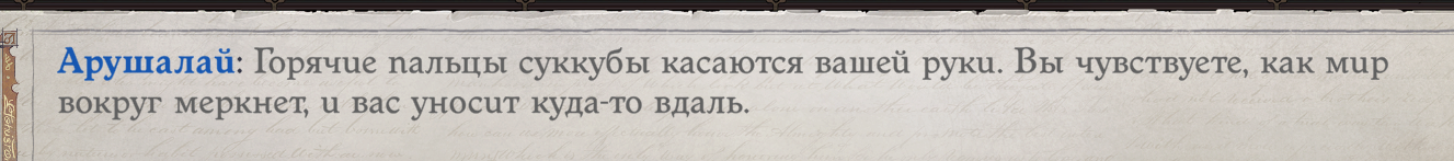 ПФ3, ВЫЗЫВАЕШЬ СУККУБУ, ТЕПЛО ВСПОМИНАЯ БОРДЕЛЬ ИЗ ГНЕВА @ ДА, ПОВЕЛИТЕЛЬ! ЛЮБЫЕ УДОВОЛЬСТВИЯ ЗА ВАШУ ДУШУ @ ВЫБИРАЕШЬ ВАРИАНТ 1: [ОТДАТЬ ДУШУ] @ С ГОГОТОМ СУККУБА ЗАБИРАЕТ ДУШУ И СРАЗУ СВАЛИВАЕТ, НАПОСЛЕДОК ПНУВ ТРУП ПО ЯЙЦАМ, ГЕЙМОВЕР @ ВЫБИРАЕШЬ ВАРИАНТ 2: "СНАЧАЛА УДОВОЛЬСТВИЯ, А ДУША ПОТОМ!" @ ОЙ, У МЕНЯ ЭТИ ДЕЛА, ГЕМОРРОЙ И АНГИНА. НЕ МОГУ НИ ДАТЬ НИ ВЗЯТЬ @ (ПРОВЕРКА РЕЛИГИИ УСПЕХ) "ТЫ ЖЕ СУККУБ, У ТЕБЯ ЭТОГО НЕ БЫВАЕТ" @ ОЙ, ВСЁ! И ВООБЩЕ Я ПОШЛА, СЕГОДНЯ ("PLAYER_CLASS") НЕ ОБСЛУЖИВАЕМ @ ВСЕ МУЖИКИ СВОЛОЧИ, ВАМ НУЖНО ТОЛЬКО ОДНО! А МЫ - ВАШИ БЕДНЫЕ ЖЕРТВЫ! @ ЧИТАЕШЬ ЗАКЛИНАНИЕ, ИЗГОНЯЕШЬ ТВАРЬ @ ИСЧЕЗАЕТ, НАПЕРДЕВ ФИОЛЕТОВЫМ ДЫМОМ @ КАЖДУЮ НОЧЬ ПРИХОДИТ В СНЫ И ЕБЕТ МОЗГИ ТЕМ, КАКОЙ ТЫ МУДАК, ИМПОТЕНТ И ВООБЩЕ СВИНЬЯ, РАССКАЗЫВАЕТ О НАСТОЯЩИХ МУЖЧИНАХ, ГОТОВЫХ НА ВСЁ РАДИ ДЕМОНИЧЕСКОЙ ПИСЕЧКИ И ПЫТАЕТСЯ ТРЕБОВАТЬ ДУШУ
