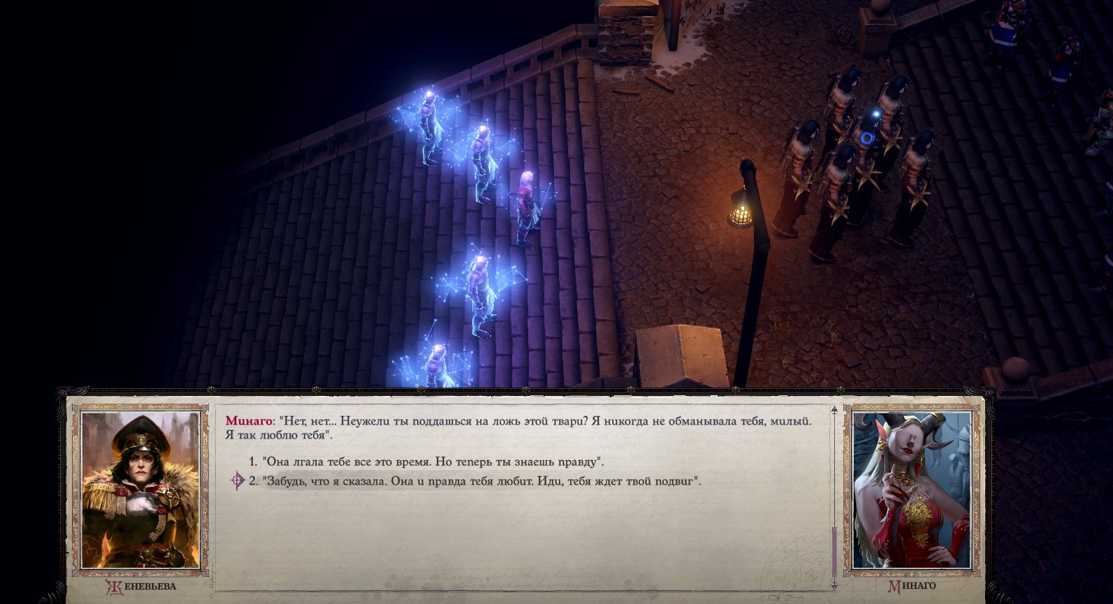 Максимально разобрался в квесте с поиском импостеров: из четырёх достаточно найти двух, прачку отпустить, а в группе из трёх дворян пройти проверку на убеждение и дать служанке заклеймить дворянина из торгашей и даровать милость старому священнику.