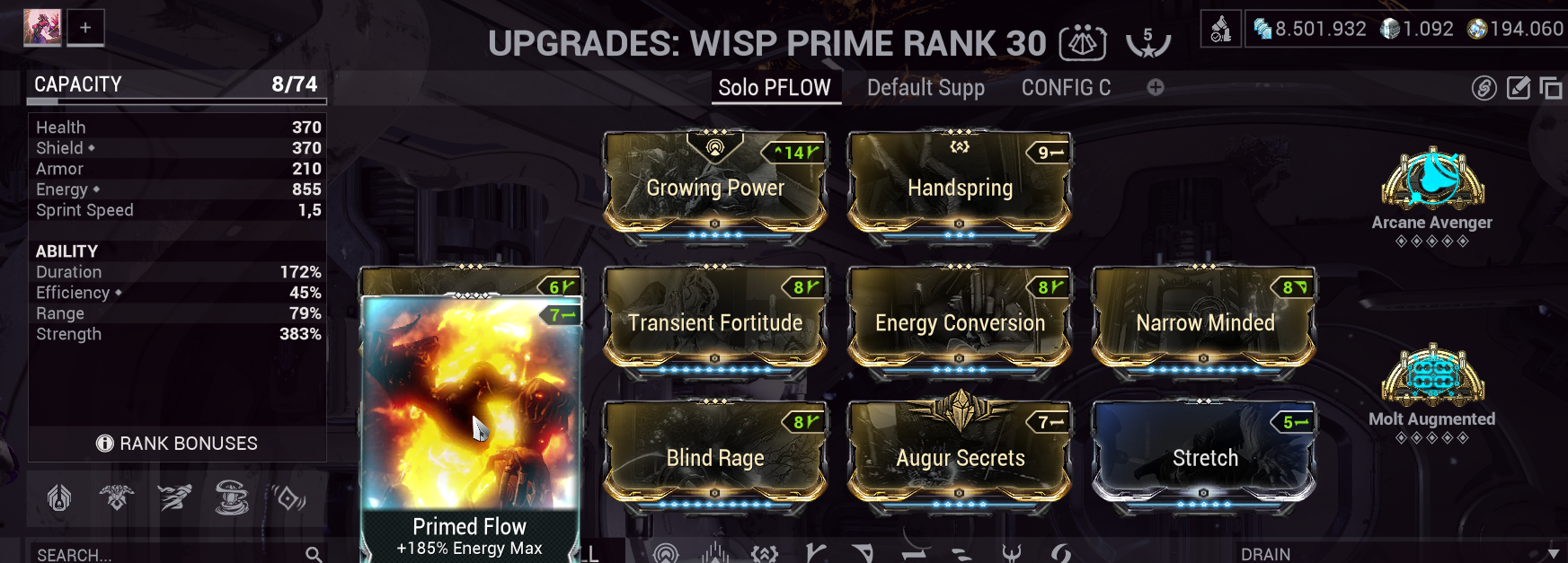 По-поводу гримуара: вот моя пикрелейтед виспа с 2 камнями на силу и прайм флоу вместо умбра мода на силу, а еще ракан авенгером вместо вигора (т.е. суммарно я могу добавить еще +45% силы камнями, 44% умбра модом и 45% арканой). Добавь еще +175% кондишн силы от ауры+мода+линьки. Зачем мне вместо норм вторички брать ссаный гримуар и вместо того, чтобы почти инстантно вначале миссии поставить цветочек, бегать с этой гейской книжкой, пытаясь настакать еще чутка силы ради общей прибаки в 10% к итого переразогнанным баффам?