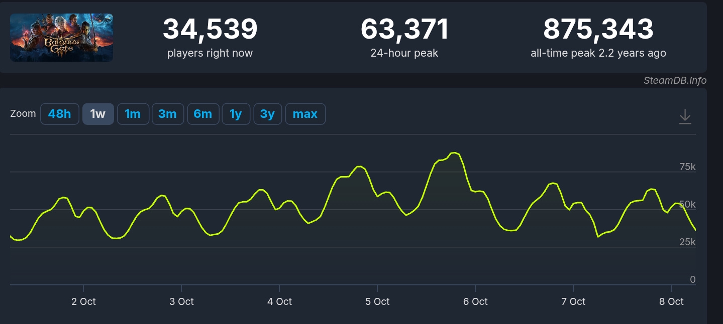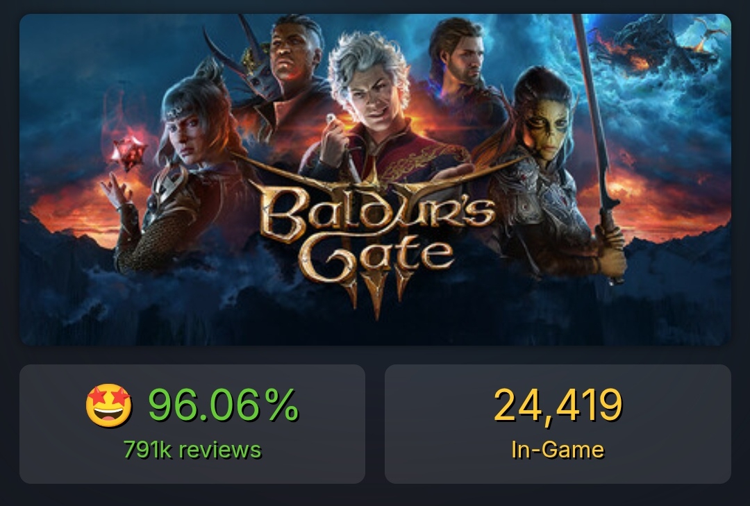 >>50368802 >При +- таком же количестве отзывов. Имхо, уже глубоко похуй на сотни-миллионы ревью после отметки в 40-50к, выборка довольно репрезентативная и метрика точная считай. >Есть ли игры с рейтингом выше? Да, у мисайда почти 98%, у экспедиции 96% (ох сколько сколько плюсиков накрутят после бесплатного большого длс). И эта цифра у бг3 опаздывает - там почти 97% по факту.