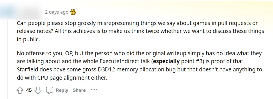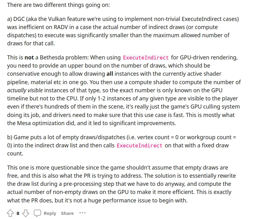 >>50369254 > конвеер рендера с пузырями и стоп-кранами в старфилде - это уже мем в геймсообществе Мем в плане того, что хлебушки чёто услышали, ничего не поняли, даванули жидкого и разнесли его по всем медиа? Да так, что разрабы DXVK потом специально уточнили, что это странно, но влияние на производительность мало. Типа, очередь выстроена для ExecuteIndirect, но она может быть пустышкой, или в ней много запросов-пустышек, и рисовать это не нужно, но сам процесс разбора этой ерунды не "бесплатный". Окей, и что? Так работает gpu-driven рендеринг, процессор нагружает очередь всем, что может быть отрисовано, без разбора, и дальше видеокарта решает, что должно быть отрисовано. Потому что видеокарта делает это быстрее, смекаешь? Если бы пустышки считал и отсекал процессор, ты бы вообще охуел.
