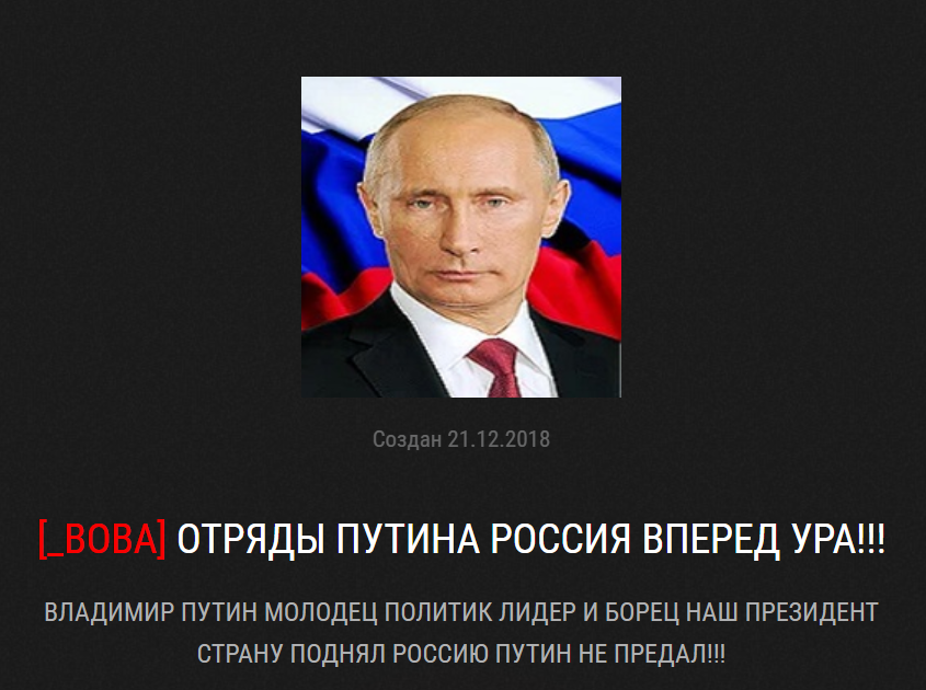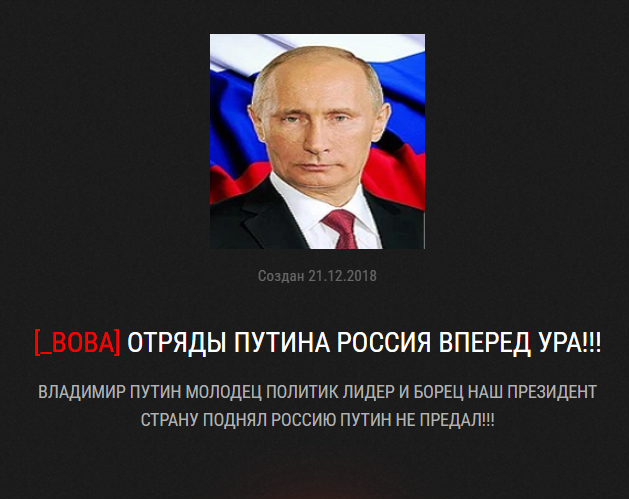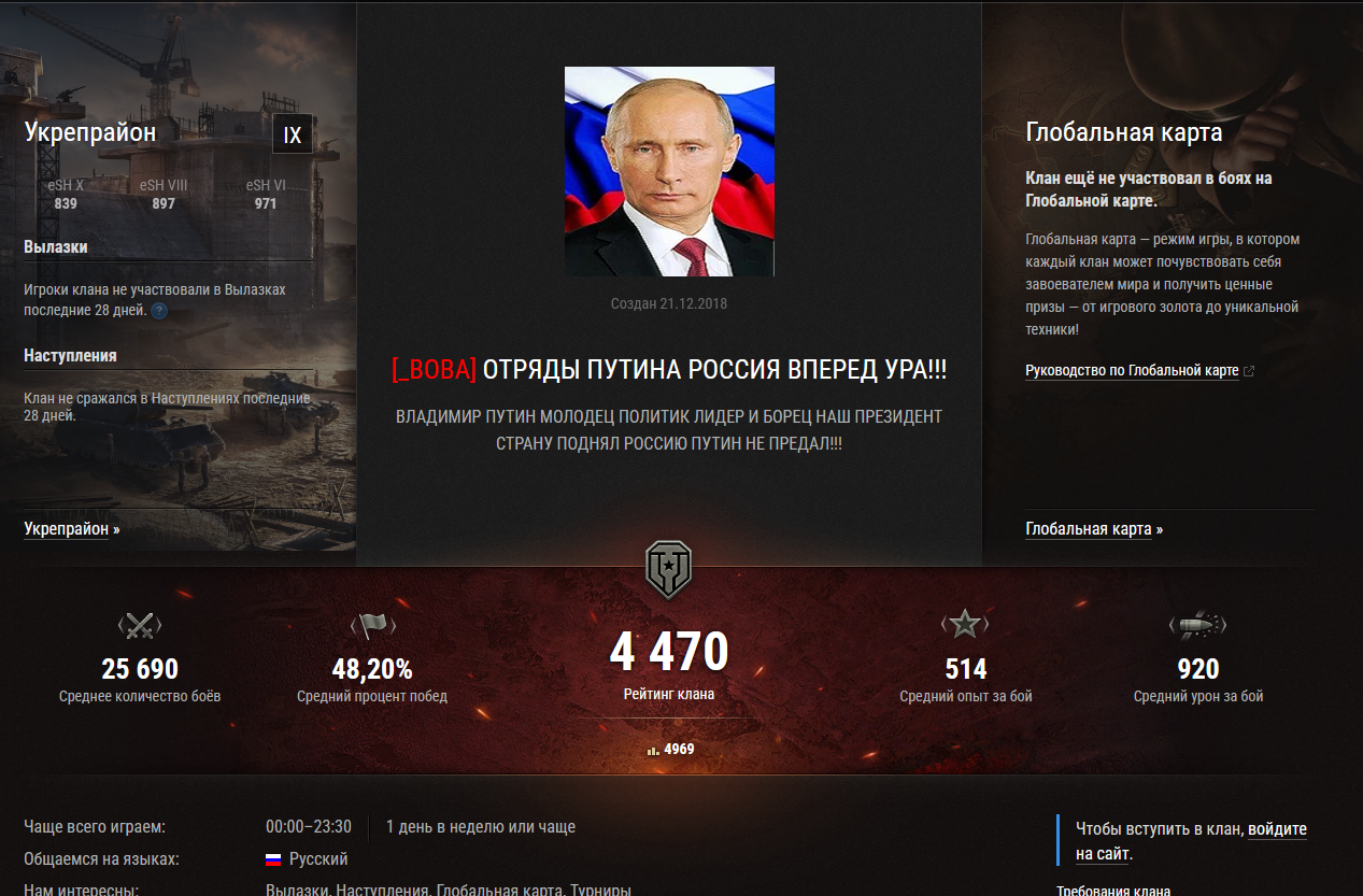 ЭТО КЛАН ДЛЯ СТОРОННИКОВ НАШЕГО ЛИДЕРА ВЕРХОВНОГО ГЛАВНОКОМАНДУЮЩЕГО ВЛАДИМИРА ВЛАДИМИРОВИЧА ПУТИНА. ВМЕСТЕ С НИМ МЫ СМОТРИМ В СВЕТЛОЕ БУДУЩЕЕ И ИГРАЕМ В ТАНКИ. В КЛАН ПРИНИМАЕМ ТОЛЬКО ПАТРИОТОВ НАШЕГО ОТЕЧЕСТВА. ДОСТУП В КЛАН ЗАКРЫТ ДЛЯ ГРАЖДАН УКРАИНЫ, ЕВРОСОЮЗА, А ТАКЖЕ СШа.