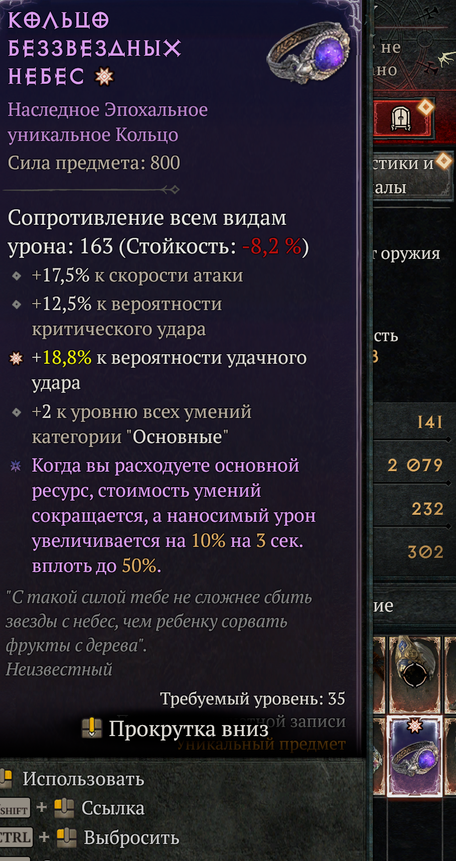 >>50310649 Теперь о "реальной" жизни. В начале игры достаточно просто ориентировать по урону/характеристикам вещи, что лучше, то и носишь на себе. в эндгейме ориентируешься по параметрам, если хотя бы 2 в легендарной шмотке лучше, чем те, которые у твоей, или больше подходят билду, идёшь к кузнецу и пытаешься нароллить 2 нужны аффикса, желательно с приближенными к максимальным значениями. Если удалось - идёшь перероллить 3-й параметр на вещи, после этого заменяешь аспект на нужный, возвращаешься к кузнецу и точишь до тех пор, пока хотя бы 2 рандомных заточки не попали в максимально эффективный для билда аффикс.