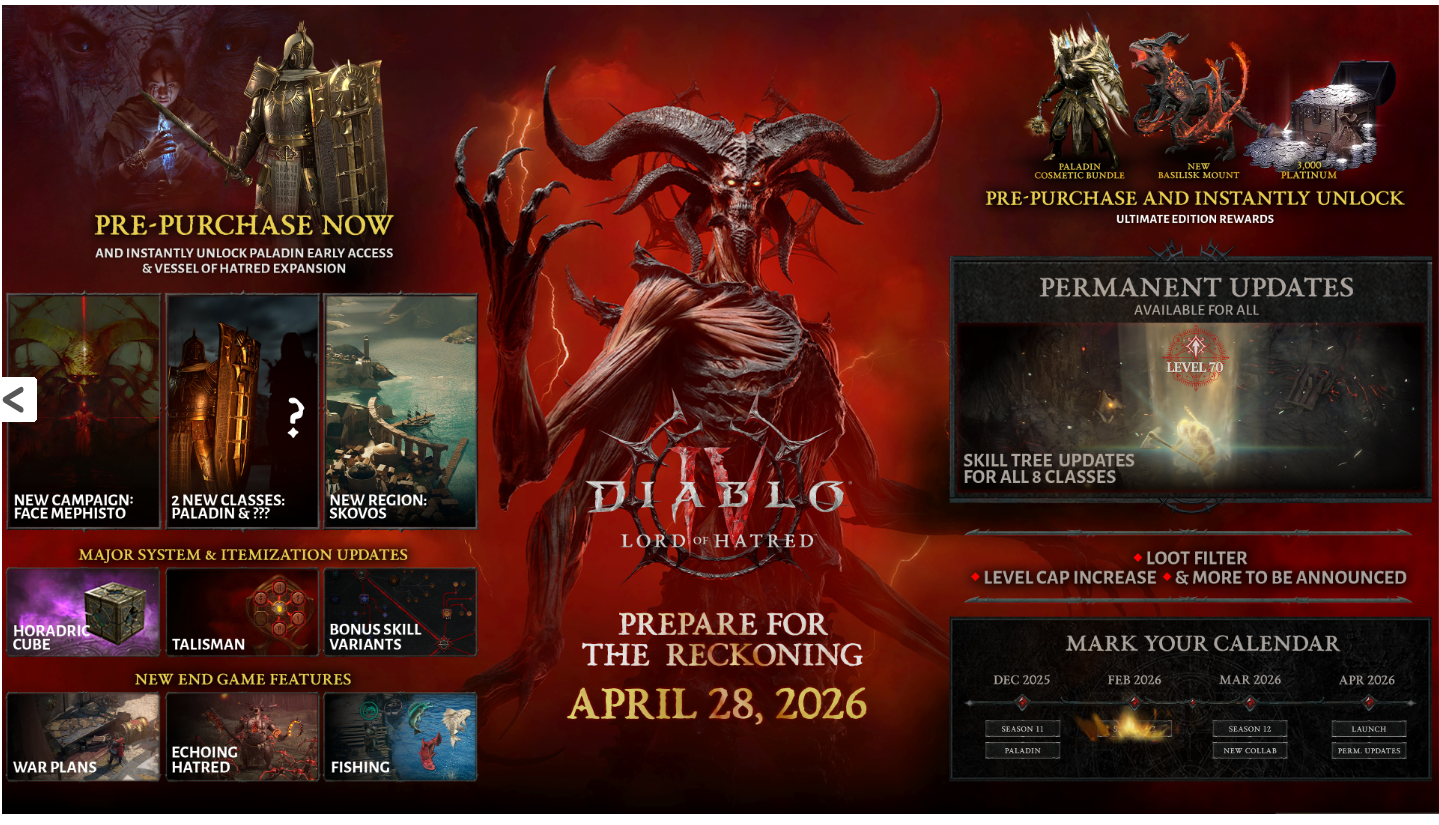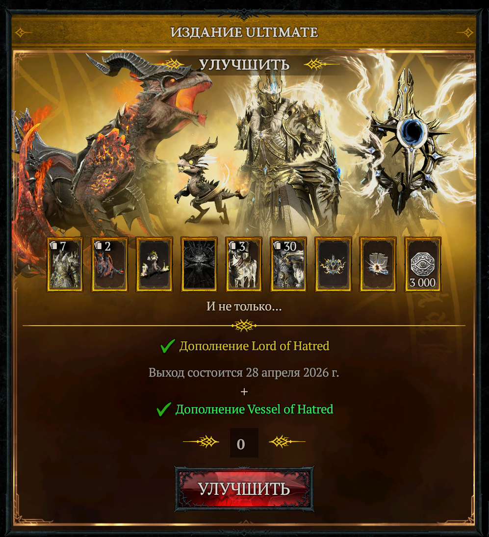 >>50599485 В данный момент есть базовая игра + 1ое дополнение Vessel of Hatred (вышло год назад) + предзаказ второго дополнения Lord of Hatred (выйдет 28 апреля 2026г). Те, кто уже сейчас предзаказал 2ое дополнение, имеют возможность прямо сейчас играть за новый класс из него - Паладина.