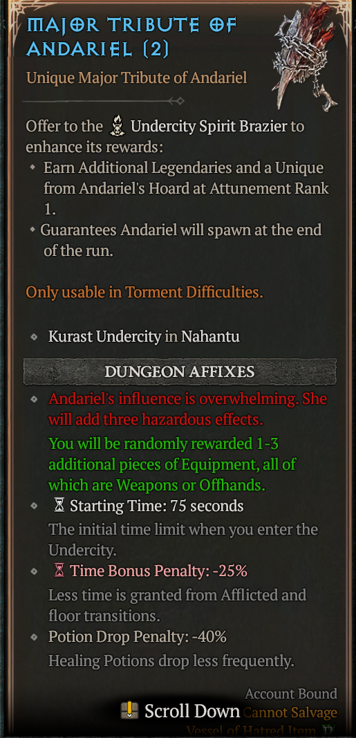Также у редких и легендарных вещей есть возможность добавления двух дополнительных аффиксов, которые, как и аспекты делятся на группы: оружейные, атакующие, защитные, поддержки и подвижности, в каждой группе ещё несколько подгрупп, стандартные и классовые, в каждой подгруппе 3-5 вариантов аффиксов. Появляются они после подбора соответствующего рецепта для кузнеца в качестве дропа с элитных мобов в поздней игре и за выполнение заданий дерева, имеют 3 уровня прокачки - синий, жёлтый и оранжевый, последние 2 начинают, как правило,падать, когда ты уже собрал все рецепты предыдущего уровня. У каждой вещи ограниченное количество рероллов таких афиксов, которое указывается во время добавления, так что тут именно тот момент, когда можно угробить хорошую шмотку. Можно однократно сбросить счётчик количества попыток с помощью свитка восстановления, которые иногда дропаются на сложности т1-т4 и за прохождения Тёмной цитадели.
