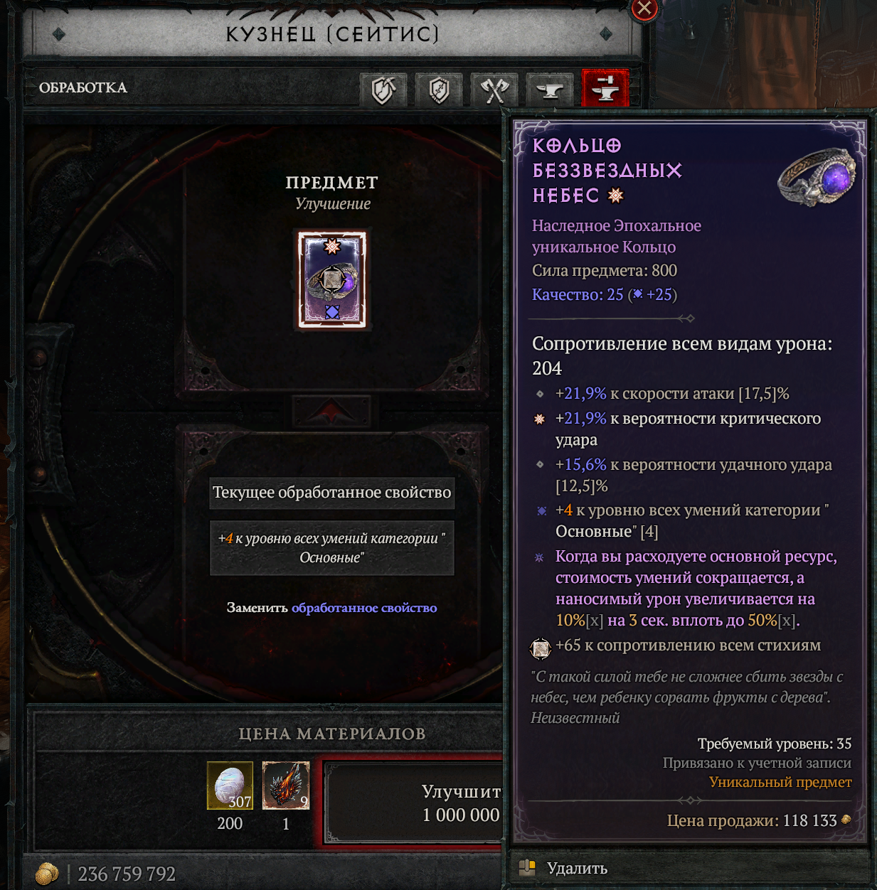 После того, как оба дополнительных аффикса добавлены, открывается возможность заточки вещи (последняя вкладка у кузнеца). Максимальный уровень заточки для вещей 750 и ниже уровня - 8, для 800 - 12. Первые 3 уровня растут все аффиксы вещи с числовым значением, на 4-ом один случайны аффикс усиливается на 25%. На остальных уровнях аналогично. Вот тут неудачную заточку можно сбрасывать сколько угодно раз, но стоит удовольствие дорого - 5 млн. золота и ресурсы. Как правило, все игроки стараются выбрать какой-то один аффикс, главный для своего билда и пытаться заточить вещь до тех пор, пока все 3 рандомных улучшения на 4, 8 и 12 уровнях не попадут в один и тот же аффикс.