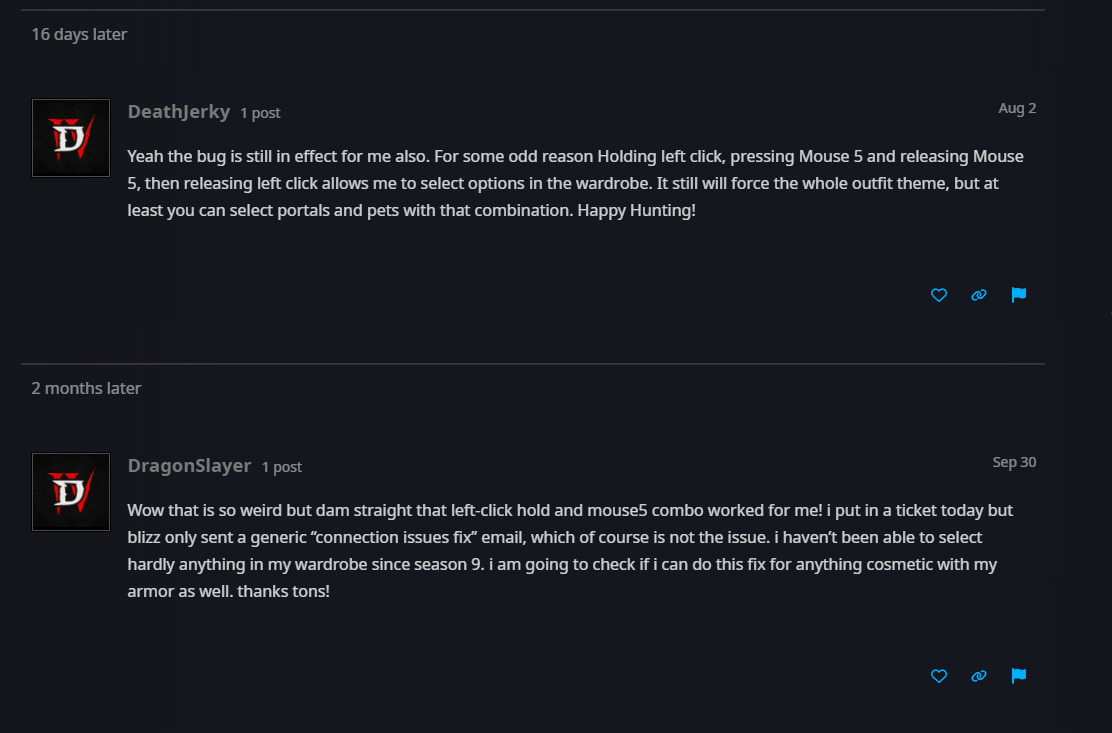 Чета игорь все таки халтура. Переключение скинов на пушки и мауна действительно заработало с вудуистской комбинацией: >Yeah the bug is still in effect for me also. For some odd reason Holding left click, pressing Mouse 5 and releasing Mouse 5, then releasing left click allows me to select options in the wardrobe. It still will force the whole outfit theme, but at least you can select portals and pets with that combination. Happy Hunting! Но выбрать скин на отдельную шмотку так и не могу, только на весь набор сразу. И учитывая что это с июня посты, чета я пиздец как сомневаюсь что это собираются чинить в ближайшее время. Лаги периодические до сих пор. До сих пор иногда персонаж типа бежит на месте, потому что все залагало к хуям. Особенно приятно на ивентах с гоблинами, и на хк офкрс (соболезную). В пое уже как полгода все починили, сервера работают идеально просто, а тут в 5 раз ниже онлайн и лагаает. Заебись, спасибо трансам на кодерах из близзов.