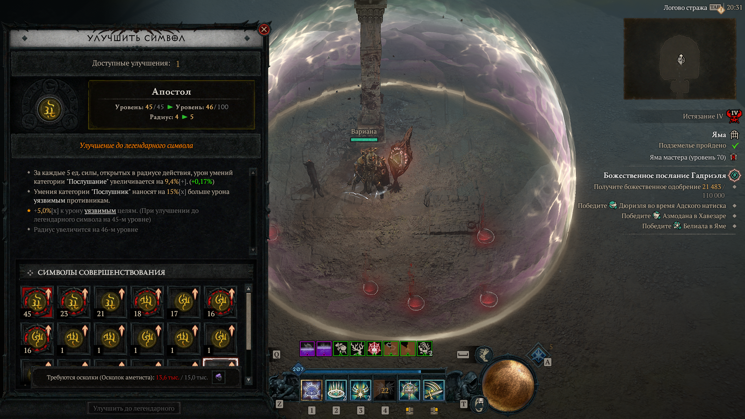 >>50599674 1) Да, сразу все аффиксы могут иметь великий статус (звезда), а вот уникальная особенность уникальной шмотки, в твоём случае уровень волка, только в заранее указанных пределах (советую в настройках игры включить подробное описание вещей, тогда справа от показателя будут указаны максимальный и минимальный возможные уровни для вещи). 2) Умения считаются первоуровневыми без рун, но, к примеру, если ты варвар, у тебя стоит руна на создание под ногами землетрясения и в шмоте у тебя стоят аспекты на усиление землетрясения, то аспекты и заточки будут влиять и на землетрясение от руны. Работают руны независимо от класса, хоть на роге баттлкрай юзай. Руны всегда работают в паре, одна генерирует ресурс, вторая его тратит. Чем мощнее генератор, тем чаще прок, соответственно. Частоту проков можешь смотреть на иконках, где баффы, там они заполняются. Анимация есть только у боевых способностей.