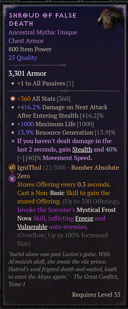 Стоит отдельно выделить вещи предков, они же вещи 800 уровня, они же вещи со звездой, они же вещи с ГА. Это усиленные версии легендарных, уникальных, мифических и хаотических предметов, которые могут иметь 1-3 (для легендарных), 1-4 (для остальных), максимизированных аффикса (опять же, выше предела стандартной шмотки где-то на 25%). В описании вещи выделяются такие аффиксы звёздами. В случае легендарных вещей, чем больше звёзд на вещи, тем больше шансов реролла дополнительных аффиксов у кузнеца. У мифических и хаотических шмоток как минимум 1 звезда всегда присутствует изначально.