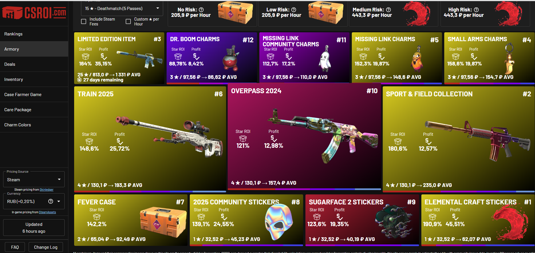 Чем тариться лучше с этим тухлым армори? Кейсы уже по 88 рублей, еле еле профита дают. По сайту выгоднее наклейки тарить, но сегодня куплю как и все, а через неделю сразу после анлока они будут стоить копьё. Я в замешательстве.