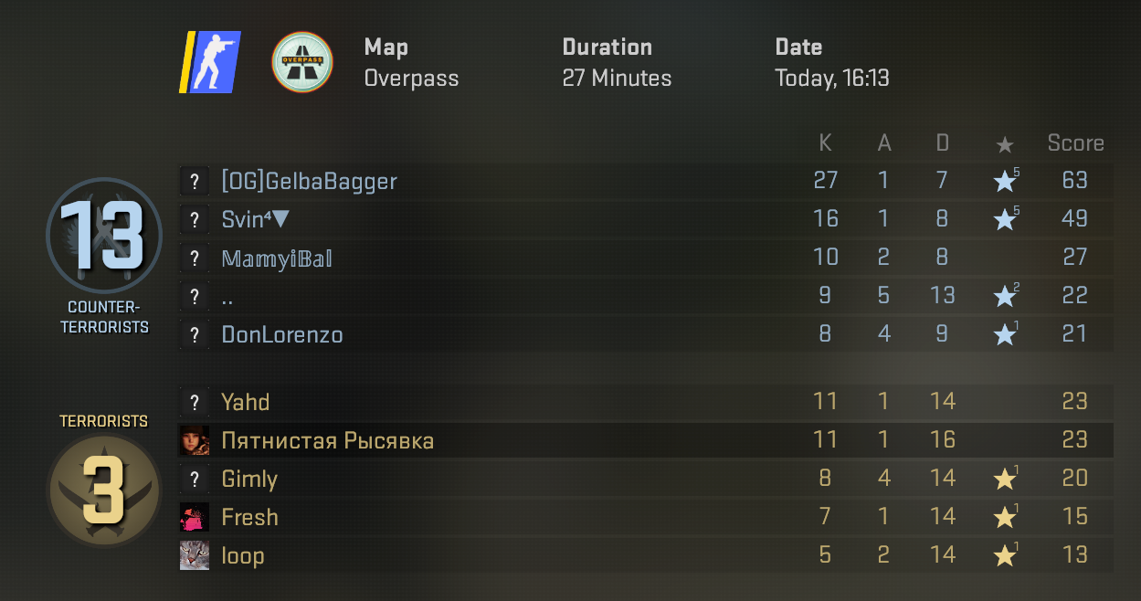 ММ вообще смысла нет играть. 2 игры выиграл, давали по 150-200 очков, окей. Потом один луз против челов у которых очков больше, за меня после 1 раунда чел просто ливает. В итоге 13-2 и минус 450 очков, пиздец кайф