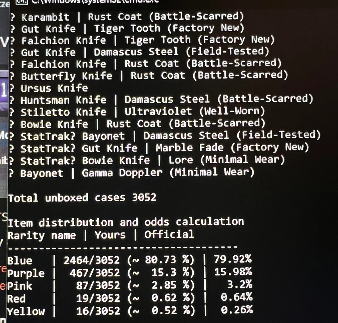 Щас чтоб получить такой же результат (рандомный нож из колеекции) нужно потратить 5 скинов. 1600 / 2 / 5 =160 долларов, еще 30% сниму за то что с кейсов кроме ножей иногда падали ценные скины по типу статрек фн калаш.