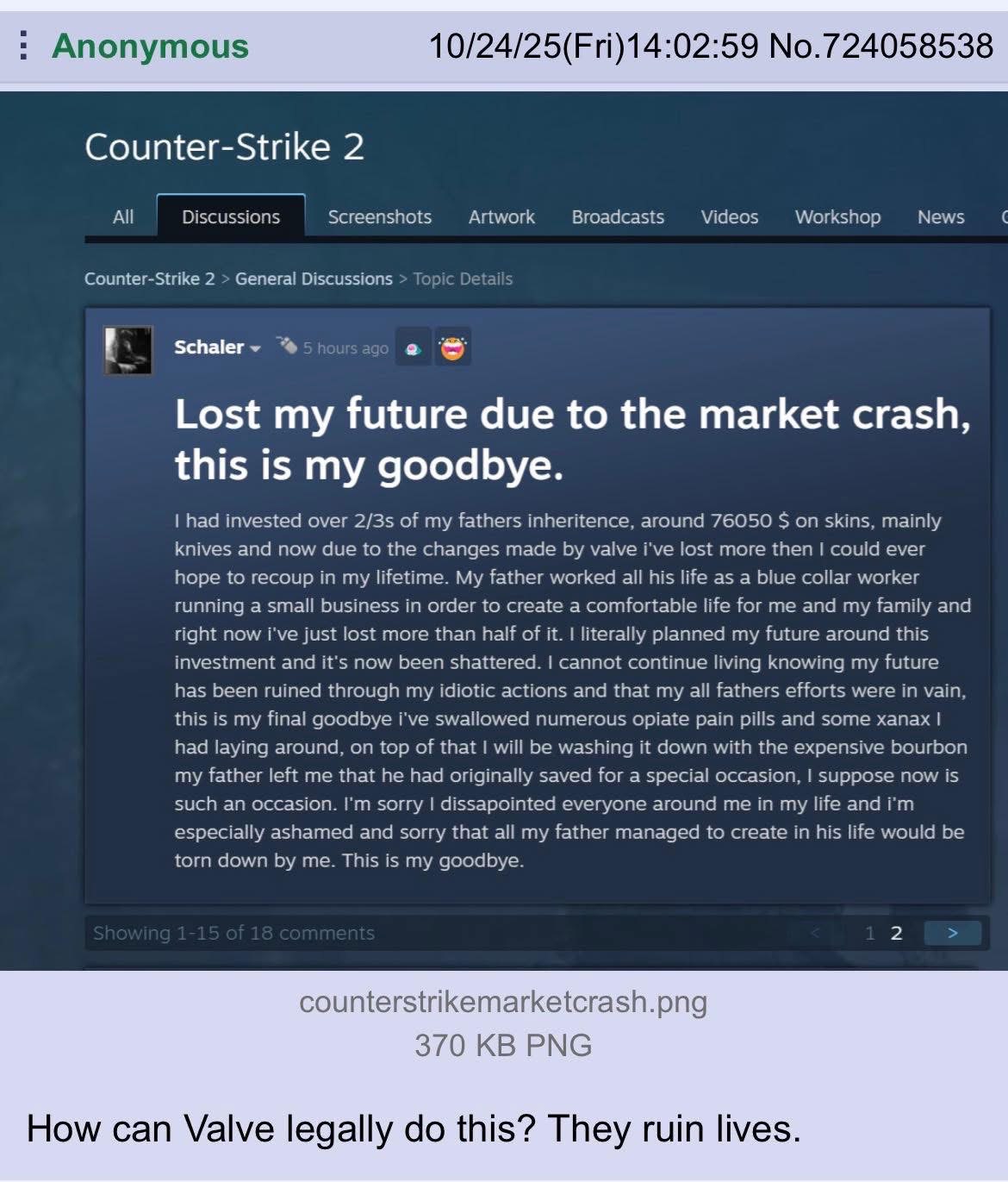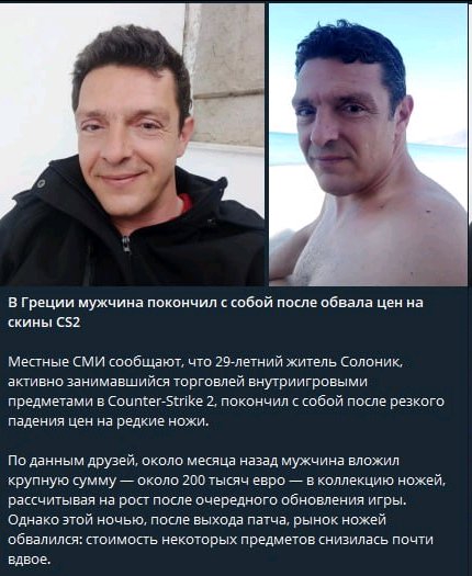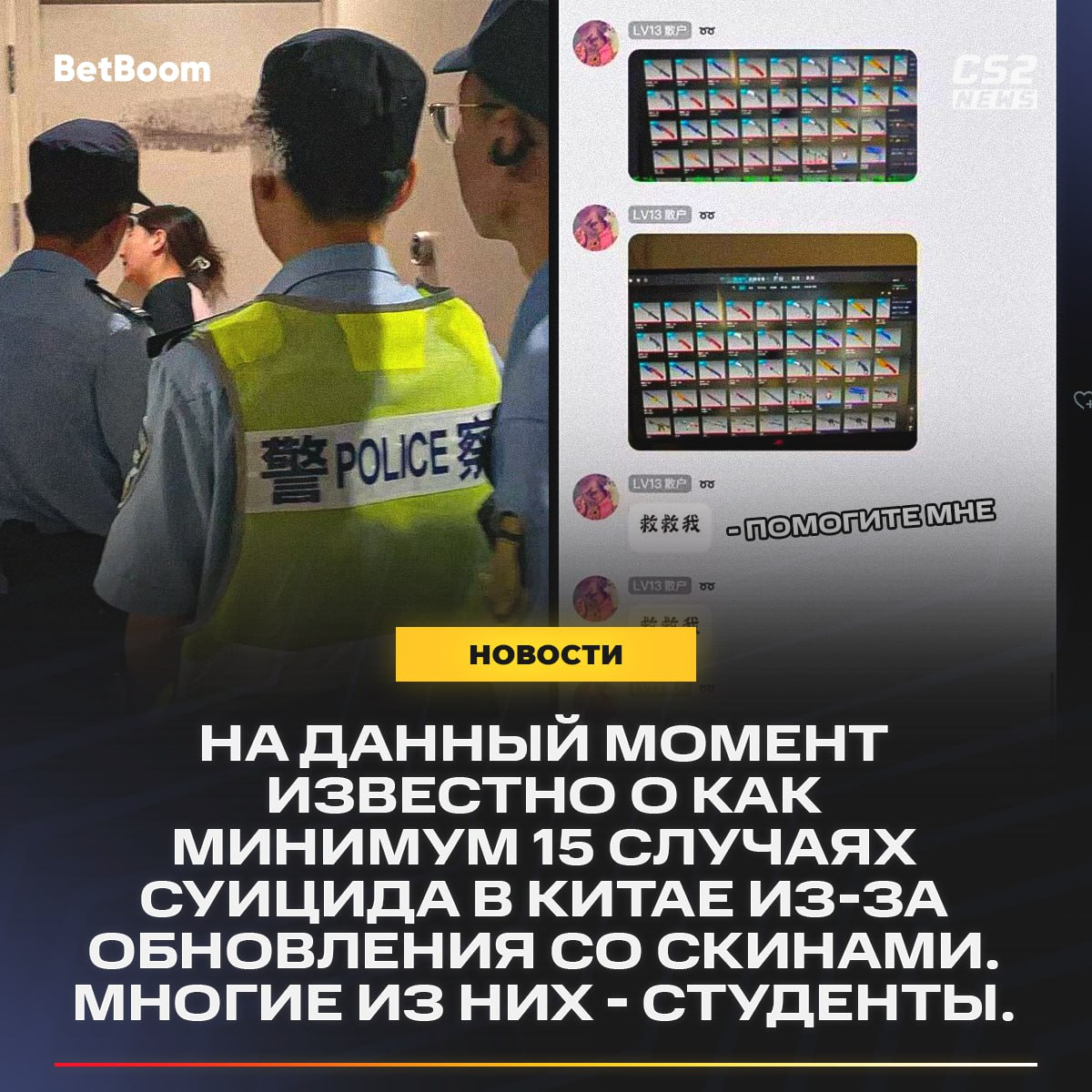 Китайский студент умер, спрыгнув с здания сегодня из-за новой политики обновления предметов в CS2 Студент покончил с собой, потеряв 150 000 юаней (около 20 000 долларов США) из-за сегодняшнего обновления политики предметов в CS2. Возможно, деньги, использованные для покупок, были взяты в кредит. Хотя у этого китайского студента явно были проблемы с психическим здоровьем, преднамеренное создание Valve краха на рынке, который заставил людей страдать от огромных потерь — и даже стоил жизней — это действительно отвратительно.