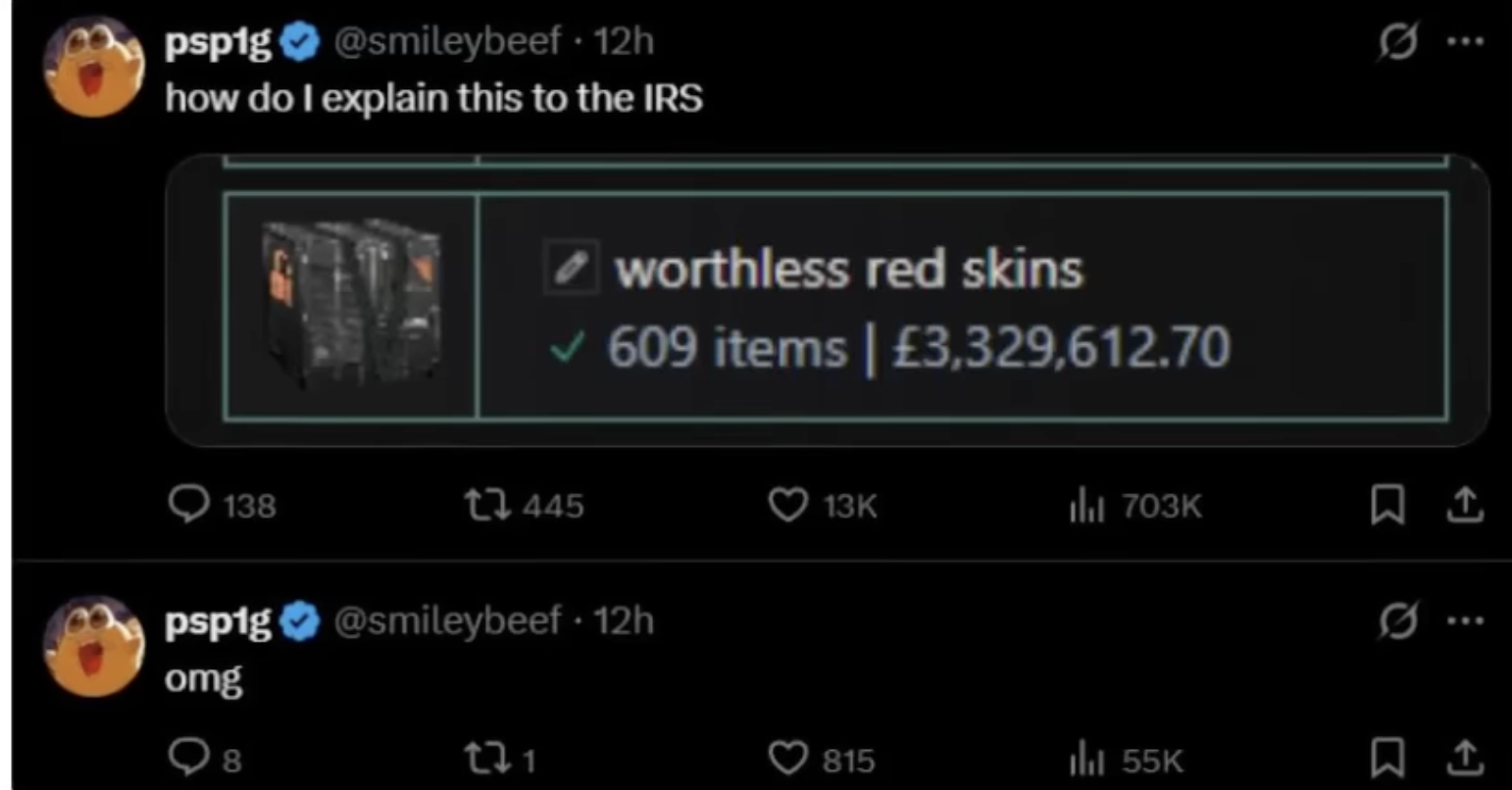 Почему все форсят этого типа? Как у него за 609 айтемов 3 с хуем миллиона фунтов стерлингов получилось? средний айтем в его кейсе стоит 5476 фунтов или примерно 7200 долларов? У него там в основном одни драгонлоры лежат? Почему он пишет про IRS которая находится в США, а цена у него посчитана в британских фунтах? В Британии шо налоговая тоже IRS называется? Короче тип нафотошопил себе картинку, а ксеры такие тупые, что схавали и форсят теперь это