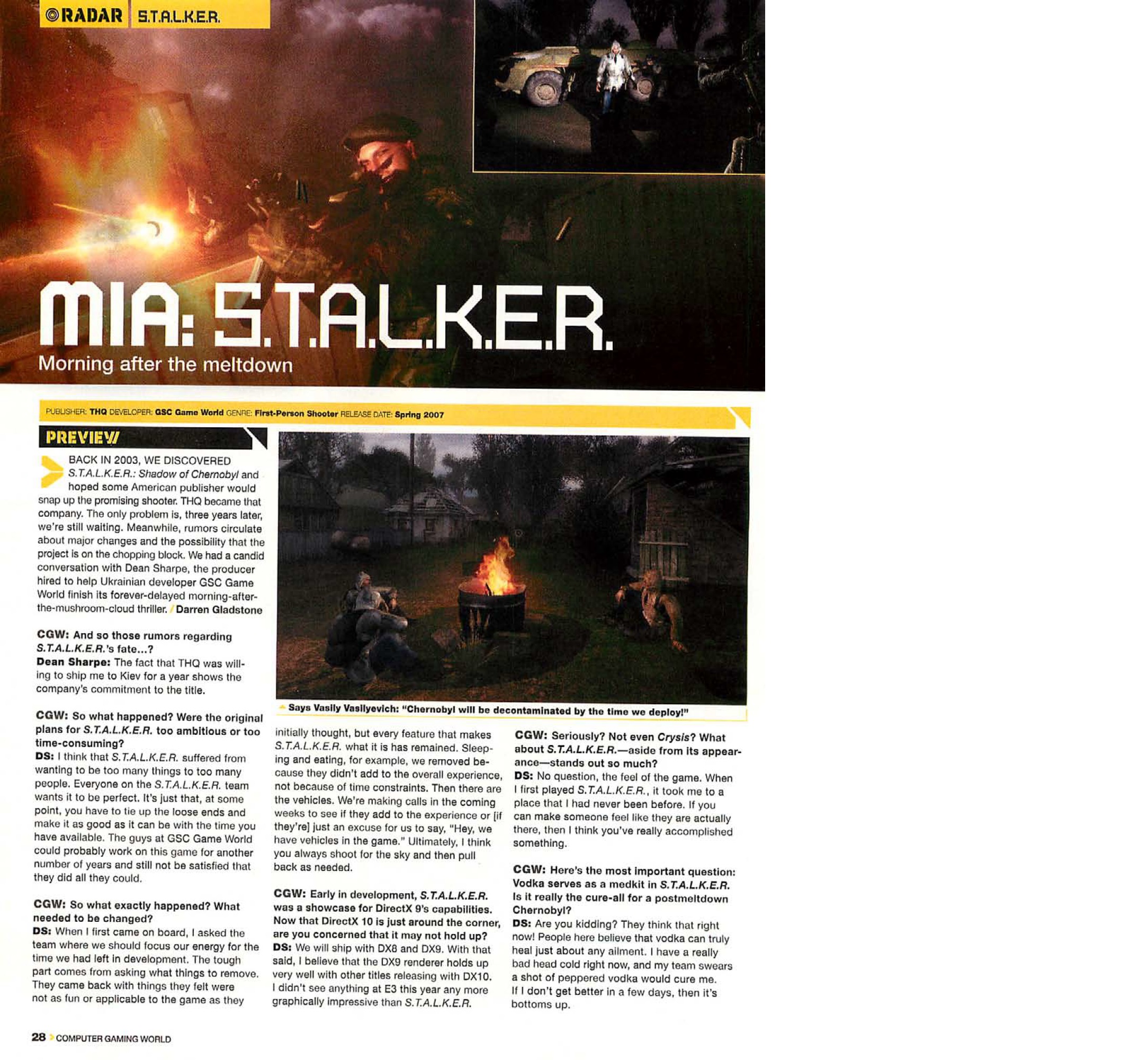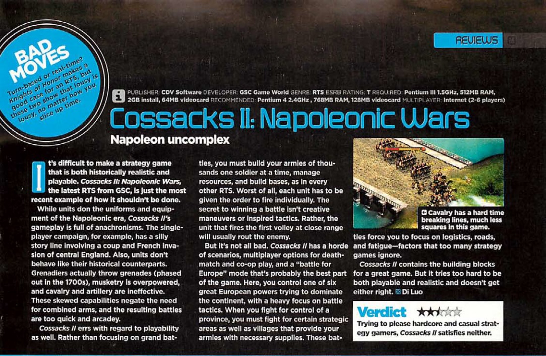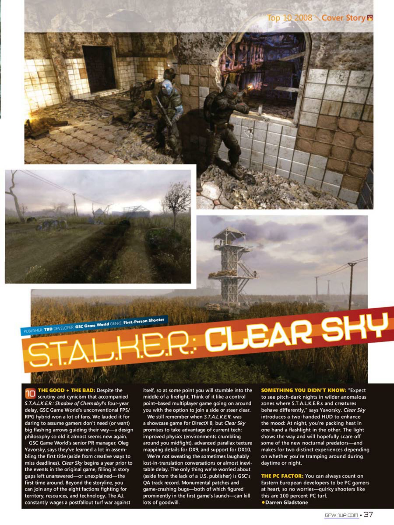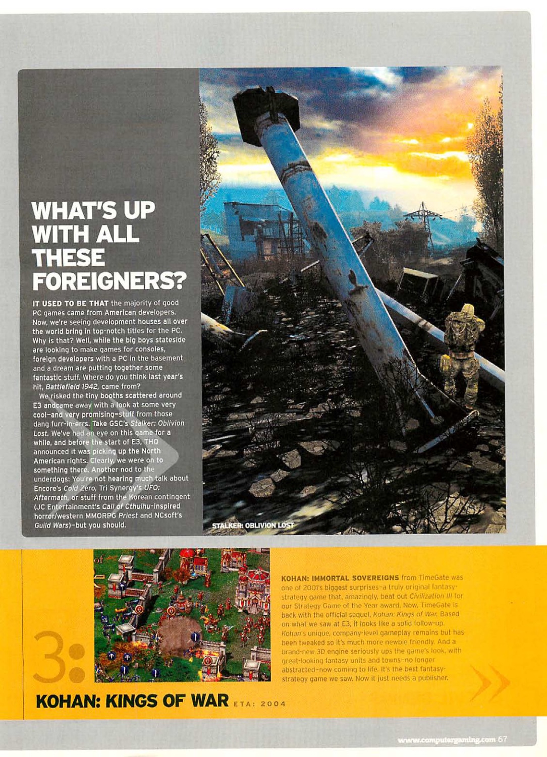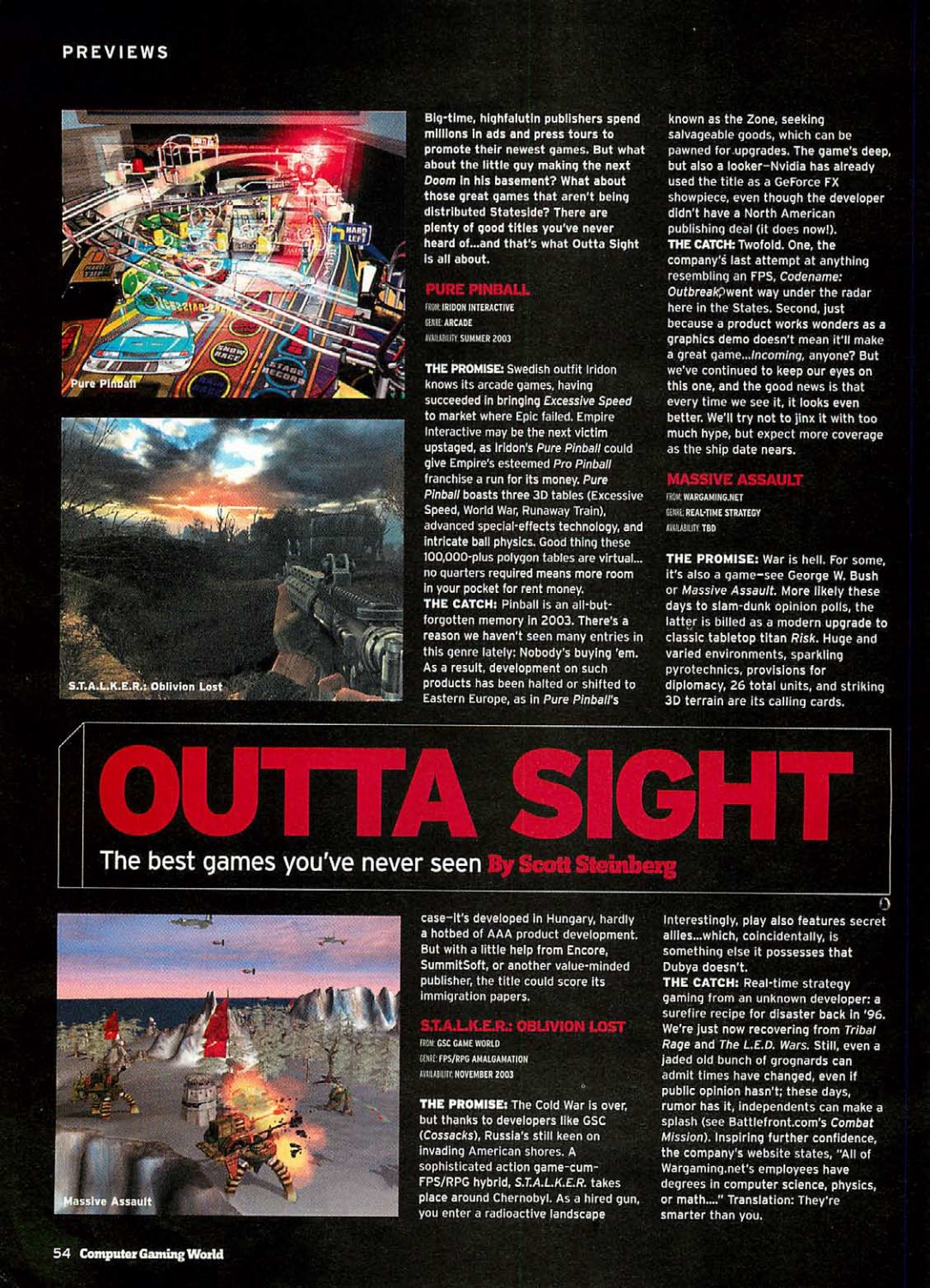 Решил поподробнее присмотреться к номерам CGW за 2001-2006 годы, во времена расцвета старопыс. Выяснилось несколько интересных деталей. Для начала - про сам журнал: 1. "А что, так можно было?" - в смысле, регулярно писать разгромные рецензии, ставить 2/5, и при этом успешно печататься на протяжении 25 лет? 2. Ассортимент. У нас старые журналы на 90% были заполнены описаниями очередных убийц CS, Warcraft и WoW, про которые уже через год никто не помнил. У американцев журналы на те же 90% состояли из статей про таких же убийц, но консольных эксклюзивов. А вот в CGW писали о тех играх, про которые до сих пор помнят олдфаги - Gothic, NOLF, Syberia, F.E.A.R. и много других страшных слов. 3. И уже конкретно про Пыс. Вот уж кто-кто, а CGW сделали всё, чтобы Грига понял - его там (в Америке в целом, и в журнале в частности) - никто с цветами встречать не собирается. Ну просто поглядите на оценки. Впечатление такое, будто в редакции был бывший сотрудник Близзард, который узнал про Warcraft 2000 и решил отплатить Григоровичу по полной. Причем оценки 2-2.5 досталось именно тем проектам, которые делались с прицелом на западный рынок - "Завоеванию Америки", "Александру", "Героям". Знал ли про это Грига? По-видимому, знал. Я не обратил особого внимания, но в рецензии на ТЧ текст на первом развороте был посвящен тому, почему редакция тогда еще CGW, а ныне "Games for Windows", отказалась от практики "эксклюзивных обзоров", и критериям оценки (Сталкер, кстати, по новым меркам получил 8/10 - "хорошо", но не "отлично"). Казалось бы, зачем понадобилось такое эксклюзивное предупреждение?