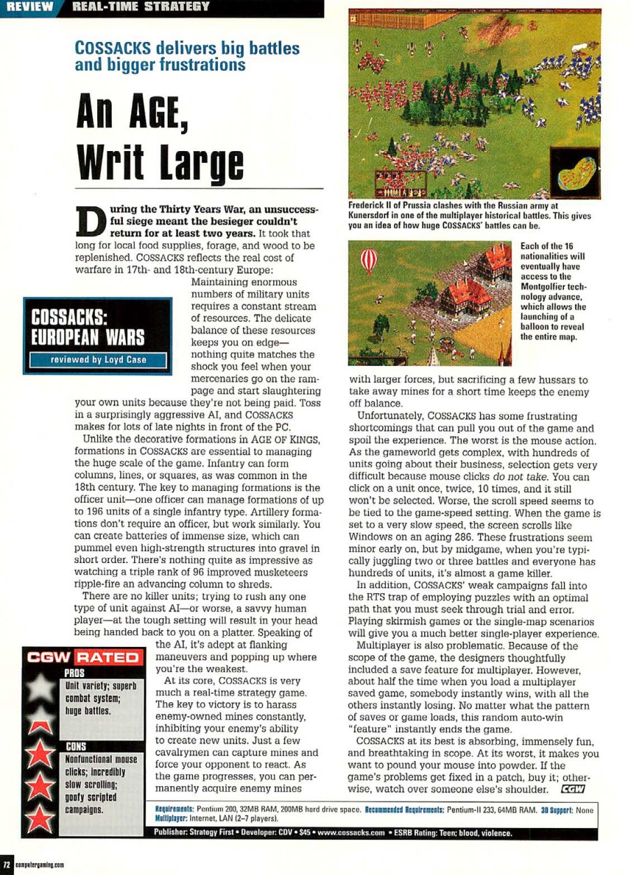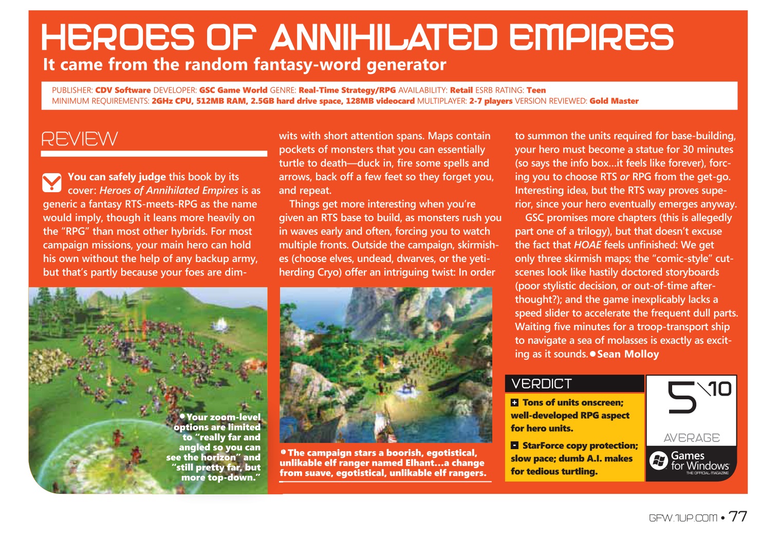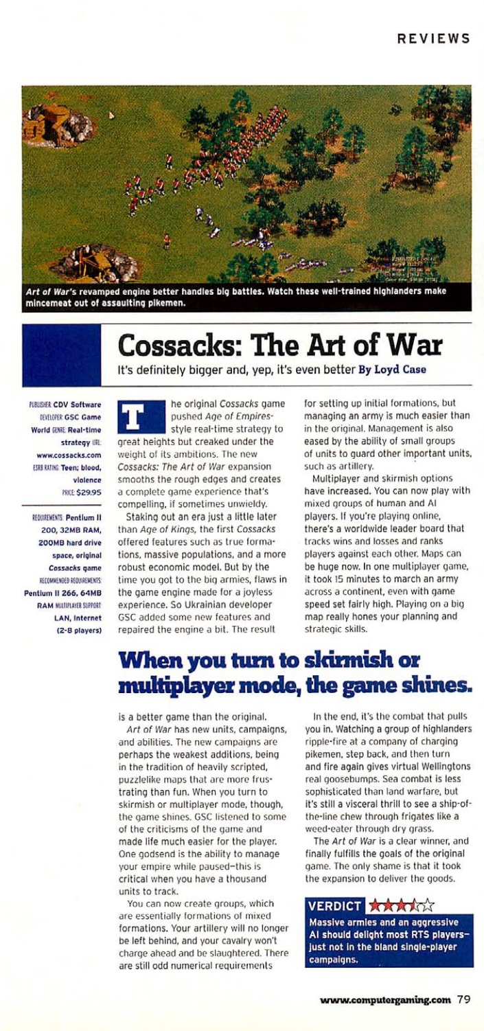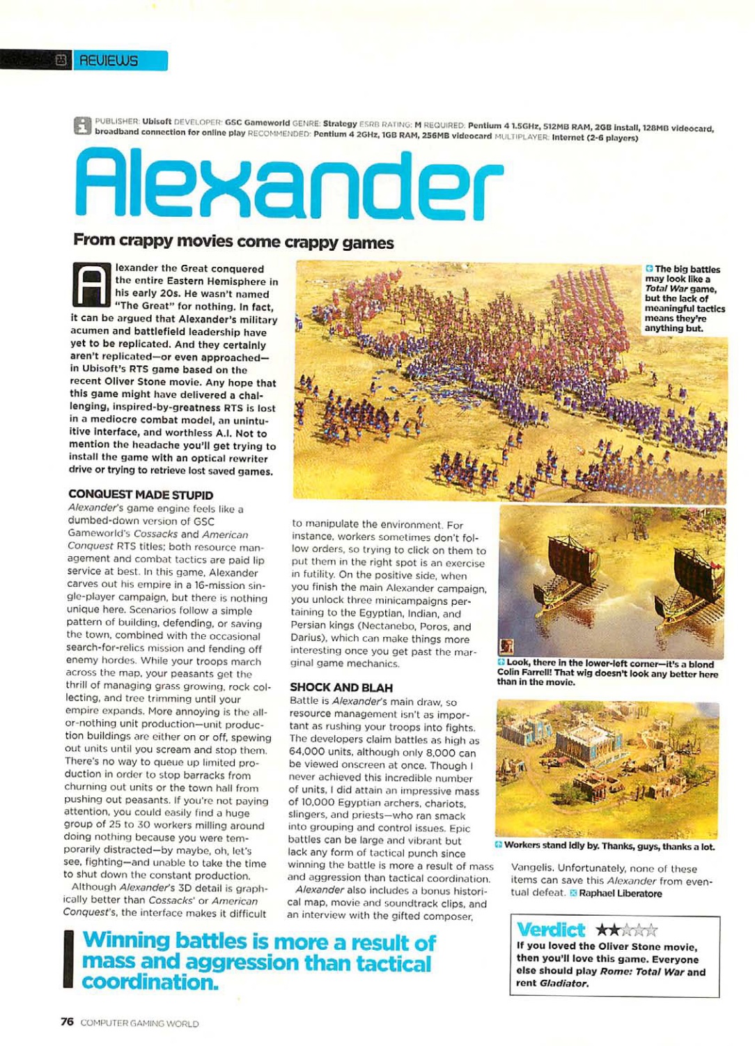 Решил поподробнее присмотреться к номерам CGW за 2001-2006 годы, во времена расцвета старопыс. Выяснилось несколько интересных деталей. Для начала - про сам журнал: 1. "А что, так можно было?" - в смысле, регулярно писать разгромные рецензии, ставить 2/5, и при этом успешно печататься на протяжении 25 лет? 2. Ассортимент. У нас старые журналы на 90% были заполнены описаниями очередных убийц CS, Warcraft и WoW, про которые уже через год никто не помнил. У американцев журналы на те же 90% состояли из статей про таких же убийц, но консольных эксклюзивов. А вот в CGW писали о тех играх, про которые до сих пор помнят олдфаги - Gothic, NOLF, Syberia, F.E.A.R. и много других страшных слов. 3. И уже конкретно про Пыс. Вот уж кто-кто, а CGW сделали всё, чтобы Грига понял - его там (в Америке в целом, и в журнале в частности) - никто с цветами встречать не собирается. Ну просто поглядите на оценки. Впечатление такое, будто в редакции был бывший сотрудник Близзард, который узнал про Warcraft 2000 и решил отплатить Григоровичу по полной. Причем оценки 2-2.5 досталось именно тем проектам, которые делались с прицелом на западный рынок - "Завоеванию Америки", "Александру", "Героям". Знал ли про это Грига? По-видимому, знал. Я не обратил особого внимания, но в рецензии на ТЧ текст на первом развороте был посвящен тому, почему редакция тогда еще CGW, а ныне "Games for Windows", отказалась от практики "эксклюзивных обзоров", и критериям оценки (Сталкер, кстати, по новым меркам получил 8/10 - "хорошо", но не "отлично"). Казалось бы, зачем понадобилось такое эксклюзивное предупреждение?