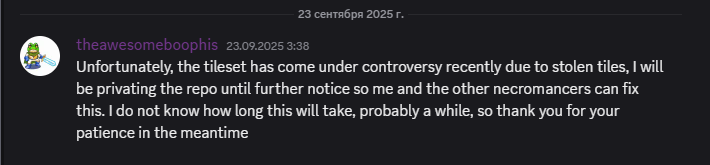 >theawesomeboophis — 23.09.2025 3:38 >К сожалению, набор тайлов недавно оказался в центре скандала из-за кражи тайлов. Я закрою репозиторий до дальнейшего уведомления, чтобы мы с другими некромантами могли это исправить. Не знаю, сколько времени это займёт, вероятно, какое-то время, так что спасибо за ваше терпение.