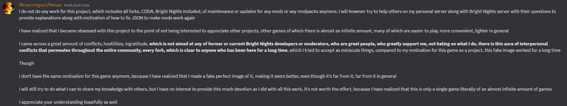 Я столкнулся с большим количеством конфликтов, враждебности, неблагодарности — и это не направлено ни на одного из бывших или нынешних разработчиков или модераторов Bright Nights, которые отличные люди и очень меня поддерживают, не осуждая за мою работу. Но существует некая аура межличностных конфликтов, пронизывающих всё сообщество, каждый форк, и это очевидно для любого, кто здесь давно. Я пытался относиться к этому как к мелочам, но по сравнению с моей мотивацией к этому проекту как к делу, это «фальшивое представление» держалось слишком долго.