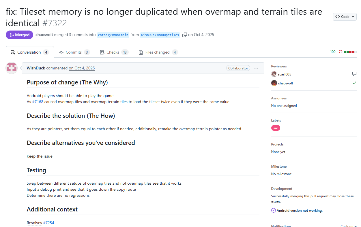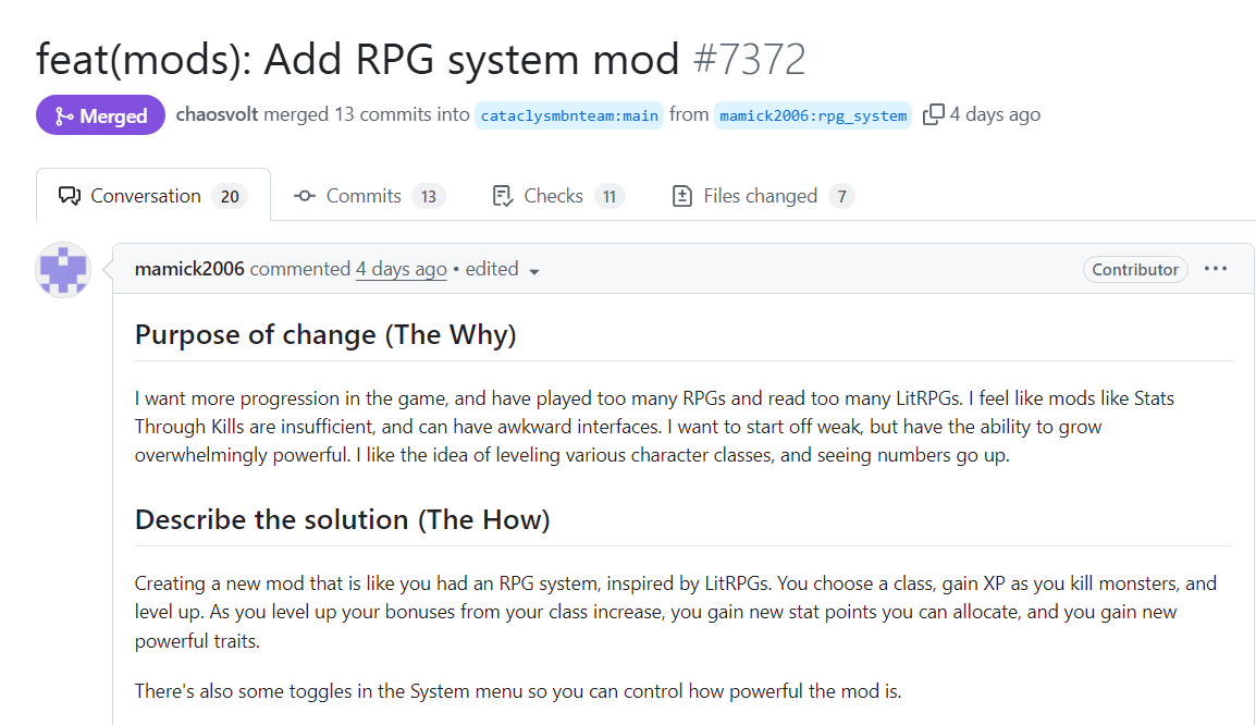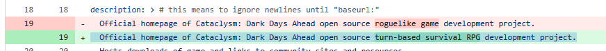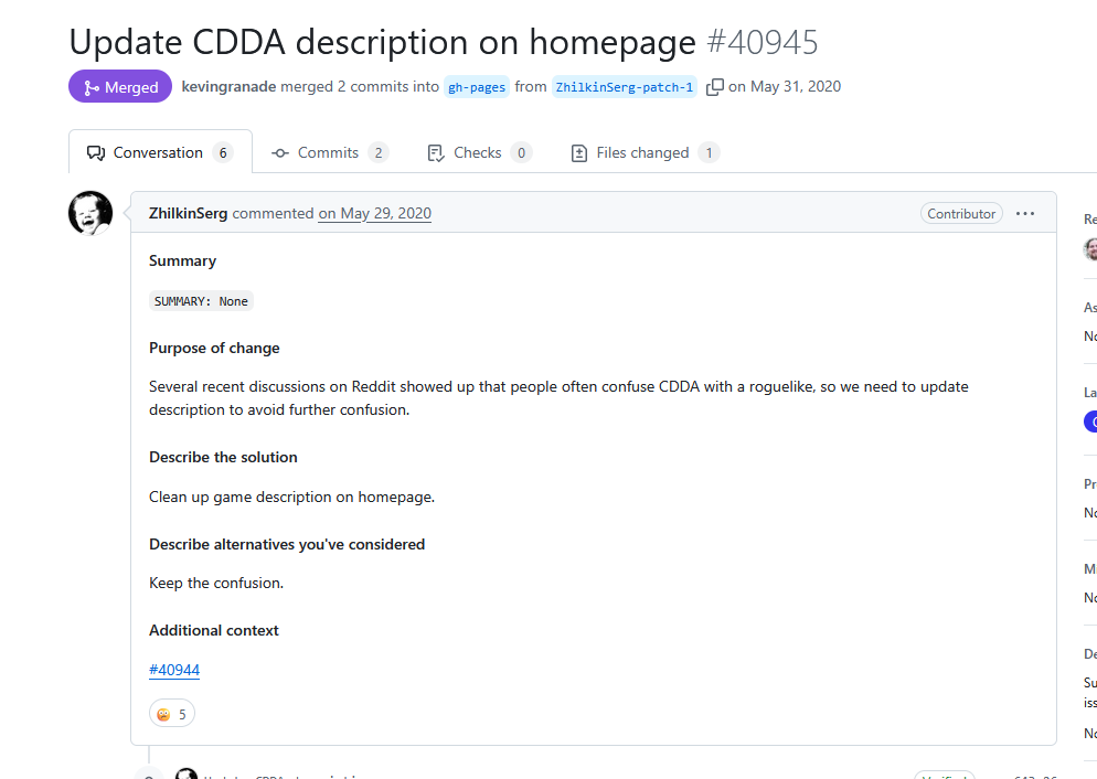 https://github.com/CleverRaven/Cataclysm-DDA/pull/40945 >ZhilkinSerg >May 29, 2020 >Обновить описание CDDA на главной странице >Цель изменения >Недавние обсуждения на Reddit показали, что люди часто путают CDDA с рогаликаком, поэтому нам необходимо обновить описание, чтобы избежать дальнейшей путаницы. > kevingranade merged commit 3889ef8 into gh-pages on May 31, 2020