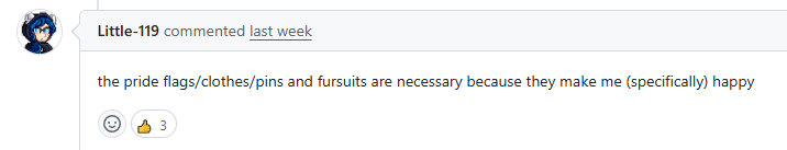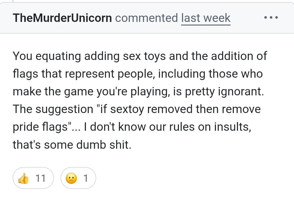Тут основной аргумент у них всегда "immersion breaking", как будто кто-то заходит в дда только чтобы специально проверить ходят ли четверть зомби в гейских колготках, а если проверю и обижусь,м? такая же дегенеративная хуита уровня "сексуализации женских персонажей в играх", которая якобы морально травмирует среднетян. Тут вопрос перспективы с какой смотреть, для разраба на гитхабе может быть вполне норм добавить например, в игру про гонки ф1 симулятор менеджера макдональдаса, чтобы они не чувствовали себя обделенными. И если все так будут делать, то со временем это будет считаться нормой. Только в игры будут меньше играть.