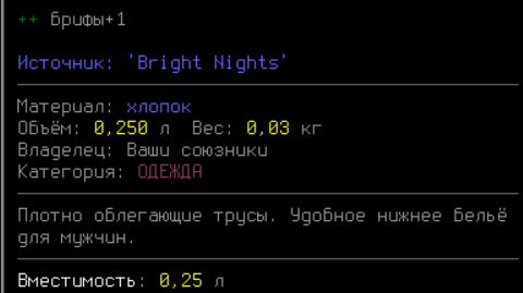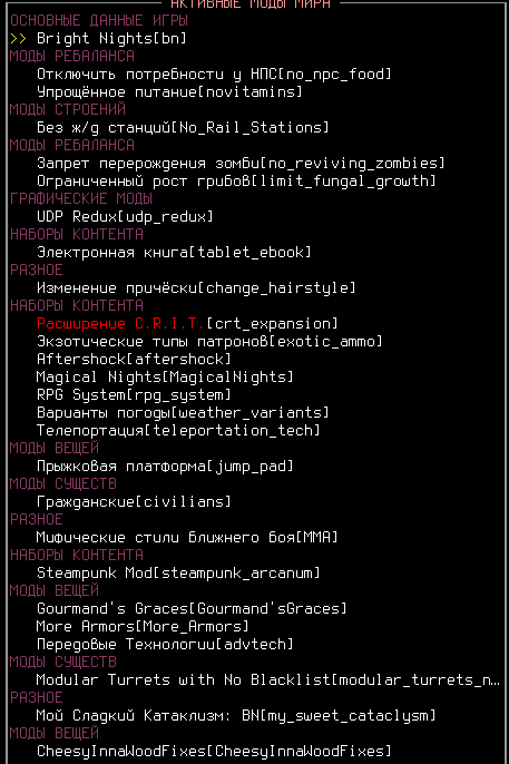 Я больше не занимаюсь этой игрой или какими-либо её форками, включая CDDA, Bright Nights и другими. Я не выполняю техническое обслуживание или обновления ни для модов, ни для модпаков. Однако я всё ещё постараюсь помогать другим на своём личном сервере и на сервере Bright Nights с их вопросами, давать объяснения и мотивацию, как исправить JSON, чтобы моды снова заработали.