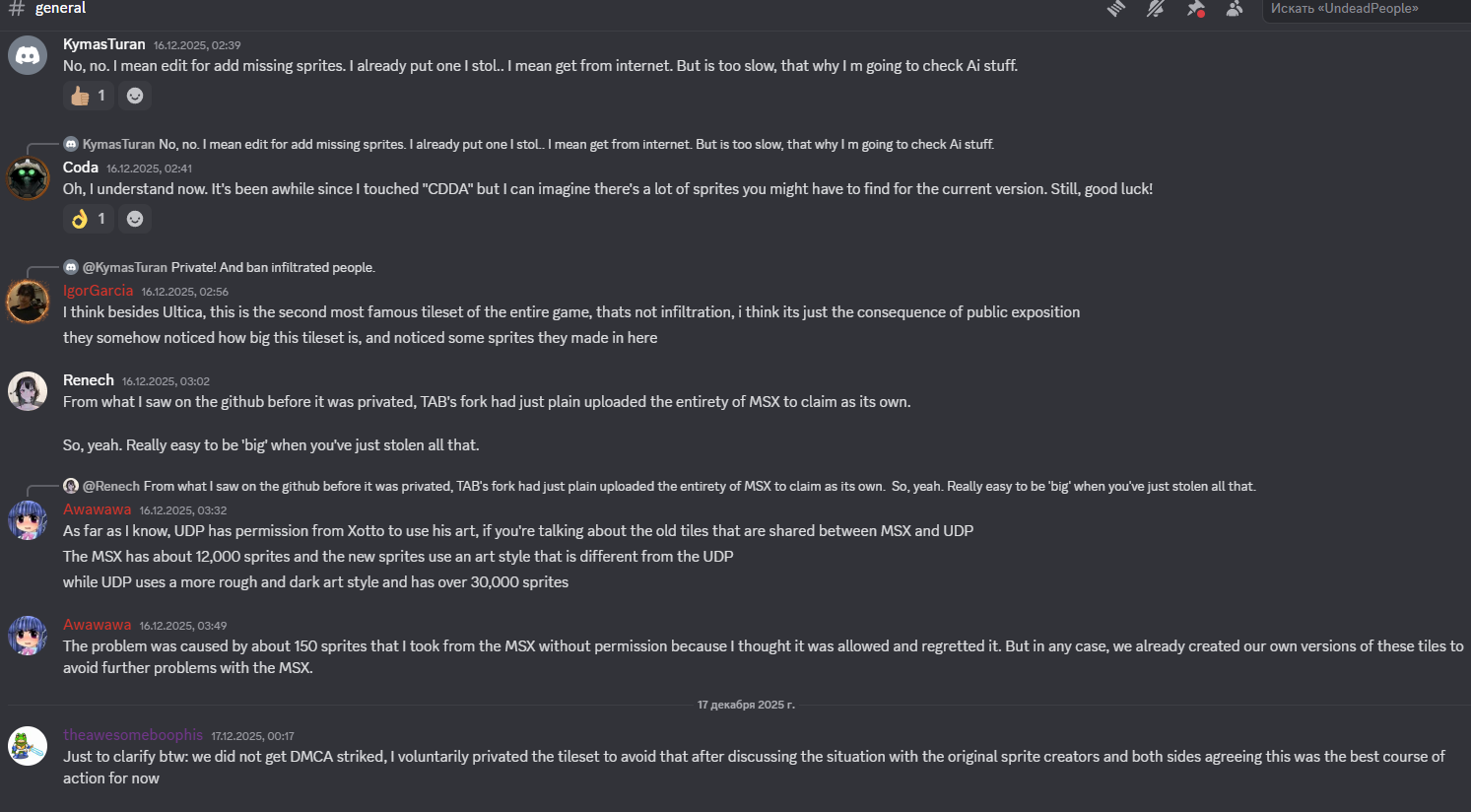 Какой-то хуй - не то школьник, не то индус - довольно долго отправлял автору тайлы которые якобы нарисовал сам, а автор на радостях их хавал. Недавно выяснилось, что всё это время те тайлы пиздились непосредственно из репозитория ДДА из тайлсета MSX (грубо говоря, форк прародителя UDP, изнасилованный Фрисом - подходит по размеру и тематике). Кевин вызвал автора на ковёр - тот сказал, заприватит репозиторий и всё почистит. А т.к. автор этот - сам то ли школьник, то ли индус, одним словом долбоёб - нихуя в программировании а уж тем более в гите не ебёт, то хуй знает, сколько эта "чистка" займёт.