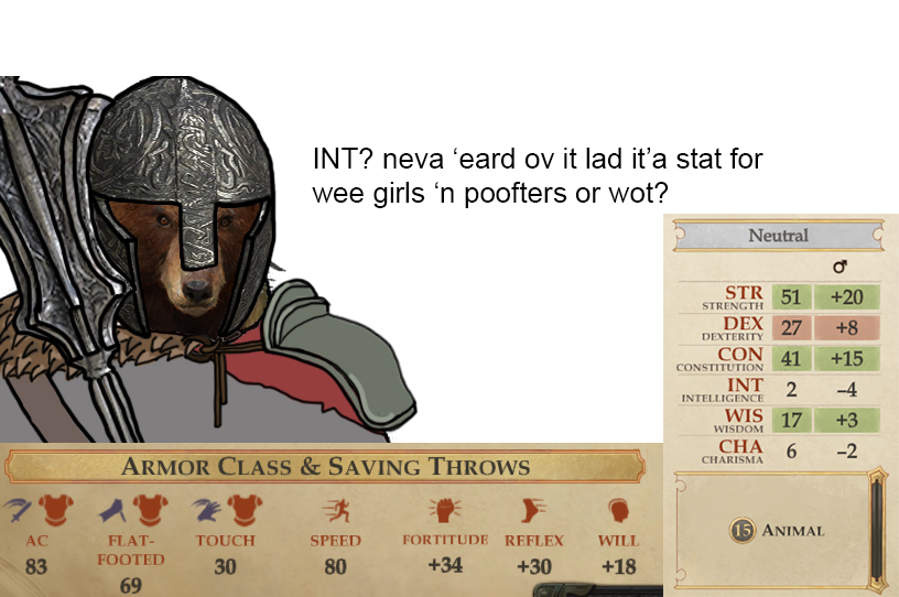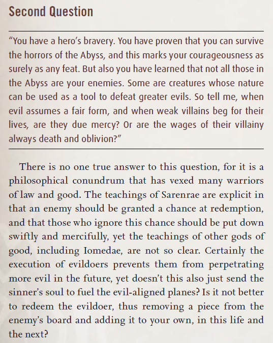 >>50335731 >высер совокуков Не, это оригинал Пайзо. >Он блять смерть принял Не смерть, а не-жизнь. Схожие, но разные вещи. >смерть не зла, она нейтральна А не-жизнь злая, поскольку энергетически работает на энергии фундаментального абстрактного зла с плана фундаментального абстрактного зла. >зло мешки мясные слабы В целом к этому большинство нежити так или иначе скатывается со временем, потому что им на мозги капает энергия фундаментального абстрактного зла. Ну и нежити в целом покровительствует Ургатоа, которая вообще не добрая и даже не нейтральная богиня. А смертью заведую Фаразма и нейтральные психопомпы.