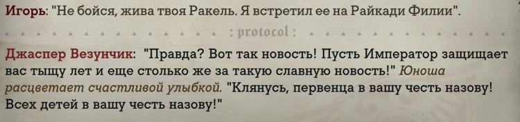 >лучший личный квест среди соратников + дают встретиться с Самим, а значит они еще оба помазанники Императора вместе с РТ Тц, как обычно дурачок в игруне играл, диалоги не читал, зато анонов в заблуждение вводить - самый первый. Это невежество Ты с Импи не встречаешься вообще ни разу А квест - это буквально нытье избалованной дочери богатого гендиректора из корейской дорамы, которая под любовно-морковным влиянием гг меняется в характере