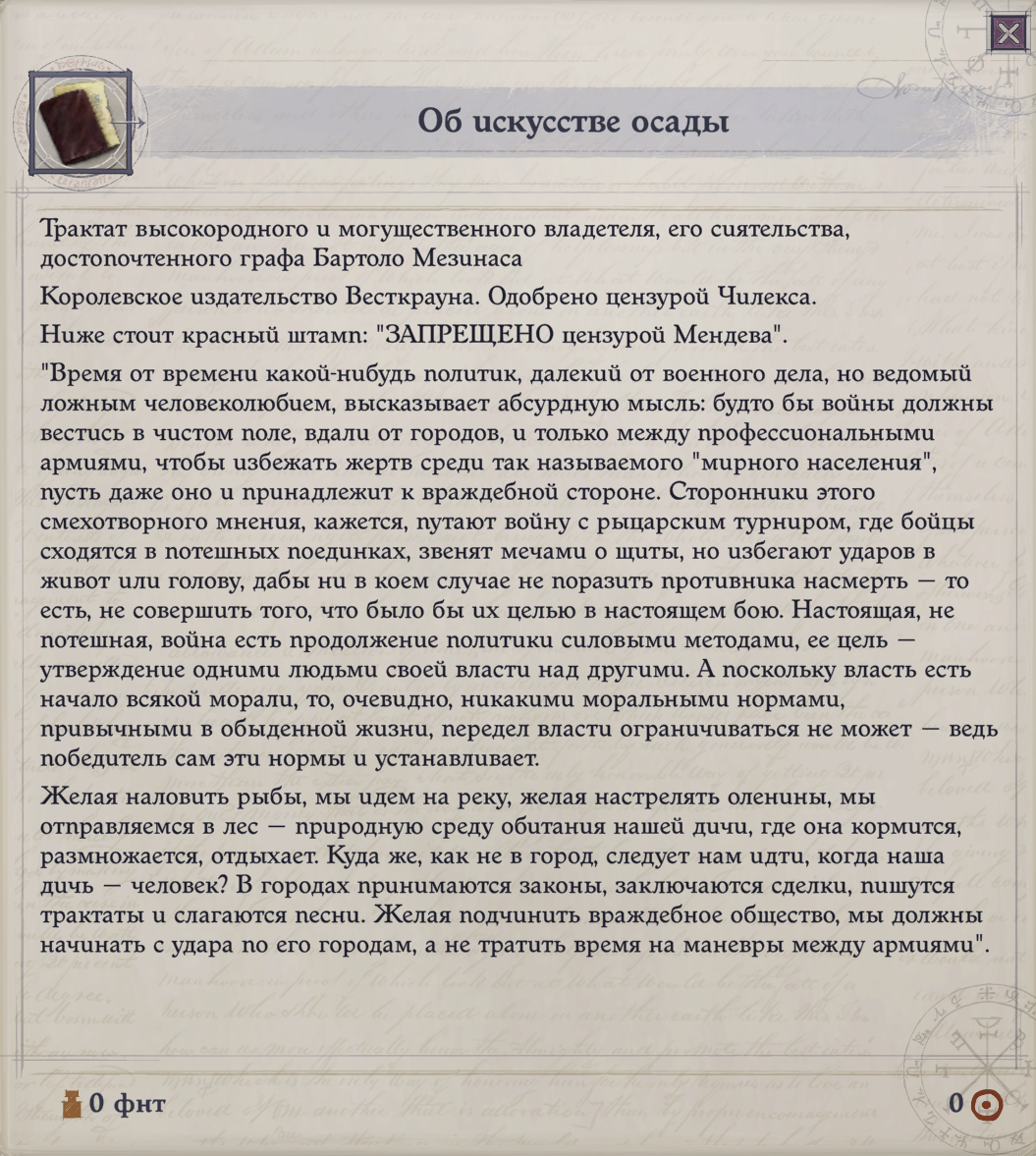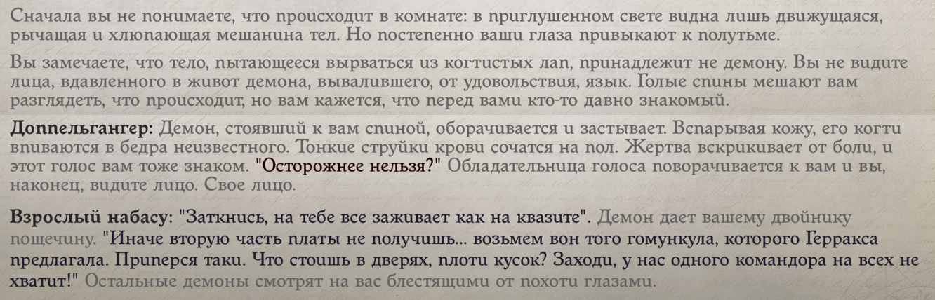 >>50333688 >"злые наклонности командующего проникли в сознание его подданных" А, это мендевский слайд на высокой Дипломатии. Он только у Лича и Демона есть. >к концу пути Лича у тебя живых то не остается в стране Только в Дрезене (и то дискуссионно, потому что на мифических советах упоминается живой мирняк, на личевской реплике в дип.совете — живые добровольцы, а в эпилоге — живые некроманты). В Мендеве-то все живы, более или менее. >Вот кроме него я думаю ничего при прохождении за легенду не увижу Его тоже не увидишь, только стандартный слайд Легенды. Максимум что в эпилогах будет глобально злого — это если не ломать Машину Столикого, тогда у тебя будет армия пси-марионеток.