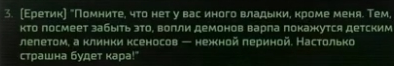 >>50333630 Кстате, а хули путь роя вообще такой ебанутый то? Зантир Ванг вон нормальный мужик был, просто разумист-исследователь по типу Ненио, который к демонам то обратился только потому, что смертные бы не выкупили прикола говорящей стаи мух. А лорд-коммандер по итогу в какого-то шиза-дуболома превращается, который только жрать и умеет. У вескаворов коллективный айкью ниже чем у саранчи чи шо?