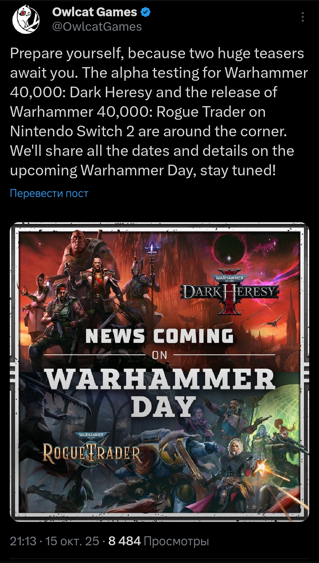 Новости: 1) Первое длц для RT, с компаньоном-ассасинкой культа смерти и расширением корабля — вышло. Второе длц, с компаньоном-негром-арбитесом-пидорасом и его летающим киберпетушатником — вышло и оказалось гораздо лучше первого. Третье длц про Тразина Неисчислимого и его бляцкий музей запланировано на апрель–июнь 2026 года. Четвёртое длц про космическую помойку запланировано на июль–сентябрь 2026 года. Релизный трейлер Void Shadows: https://www.youtube.com/watch?v=hsgKGORxxXc[РАСКРЫТЬ] Релизный трейлер Lex Imperialis: https://www.youtube.com/watch?v=Dh9lu23PCiA[РАСКРЫТЬ] 2) Owlcat представила The Expanse: Osiris Reborn, будущая Аction RPG по вселенной Экспансии. Анонсирующий трейлер: https://www.youtube.com/watch?v=pIQifuOTTe8[РАСКРЫТЬ] 3) В разработке следующая игра совокотов по вселенной Warhammer 40000 - Dark Heresy. Анонсирующий трейлер: https://www.youtube.com/watch?v=mmfu_Spm-6U[РАСКРЫТЬ] Сюжет: https://www.youtube.com/watch?v=dmjOBcas1ac[РАСКРЫТЬ] 4) Патч 2.5 для ВОТР с реворком мифика Золотого дракона вышел, заодно появилась GOTY версия со всеми контентными дополнениями. Это последнее добавление контента в игру. Кто ждал финального релиза - это он.