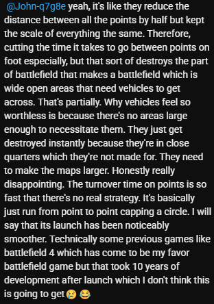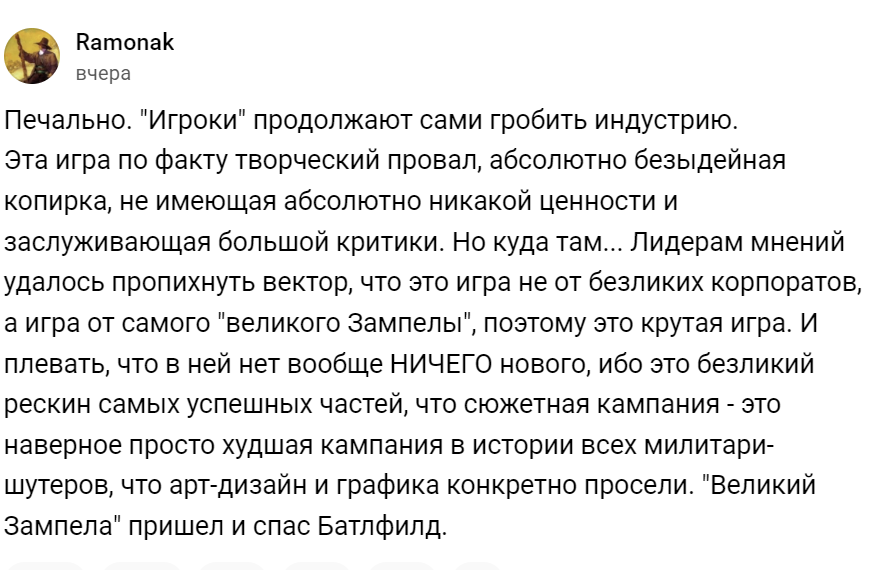 Мне кажется это база пиздец. Ладно мы которые похавали 2042 и привыкли к кривой хуите по кличке батла, но лямы людей которые повелись на хайп после бетки, мне их даже жаль...