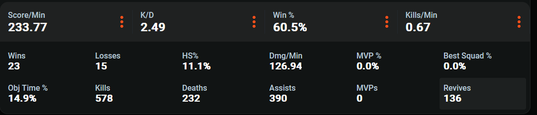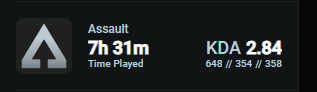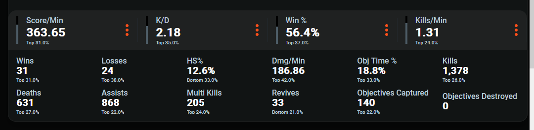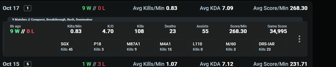 Киллы тоже, не смотря на то что бегаю и ношусь как ебанутый, килл в минуту скачет по показателям, последние дни было 1.22. То есть учитывая что я на передке в самых динамичных крупных режимах, на пехоте делается чуть больше килла в минуту.