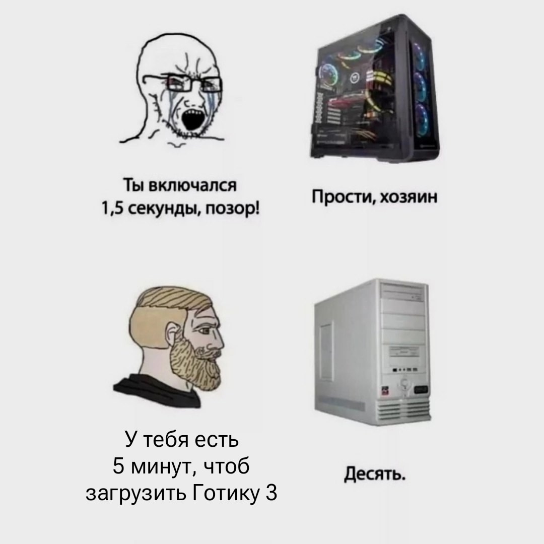>>50419009 В 2004-ом, когда я впервые играл в Готику 1, она у меня загружалась без шуток минут 7-10. Потом я пару раз обновлял комп. А потом вышла Готика 3 и грузилась тоже минут по 5 каждый раз.