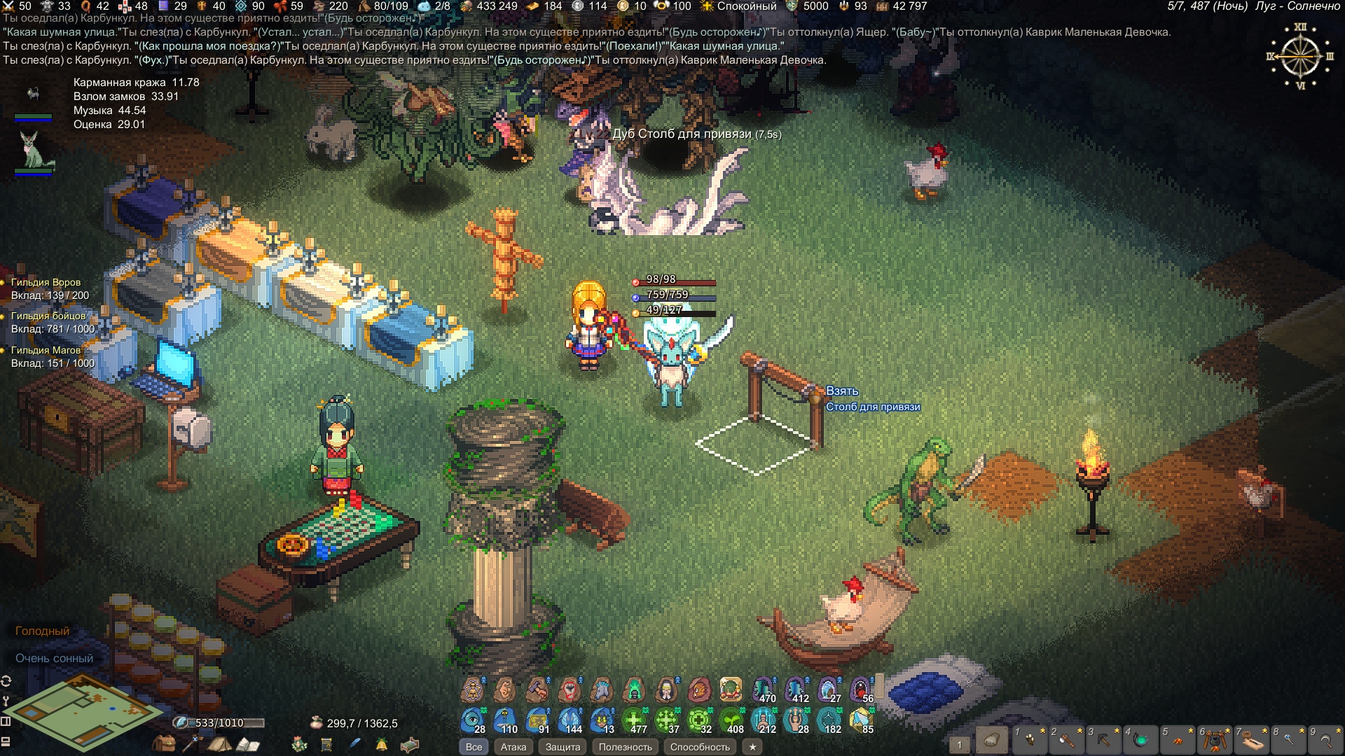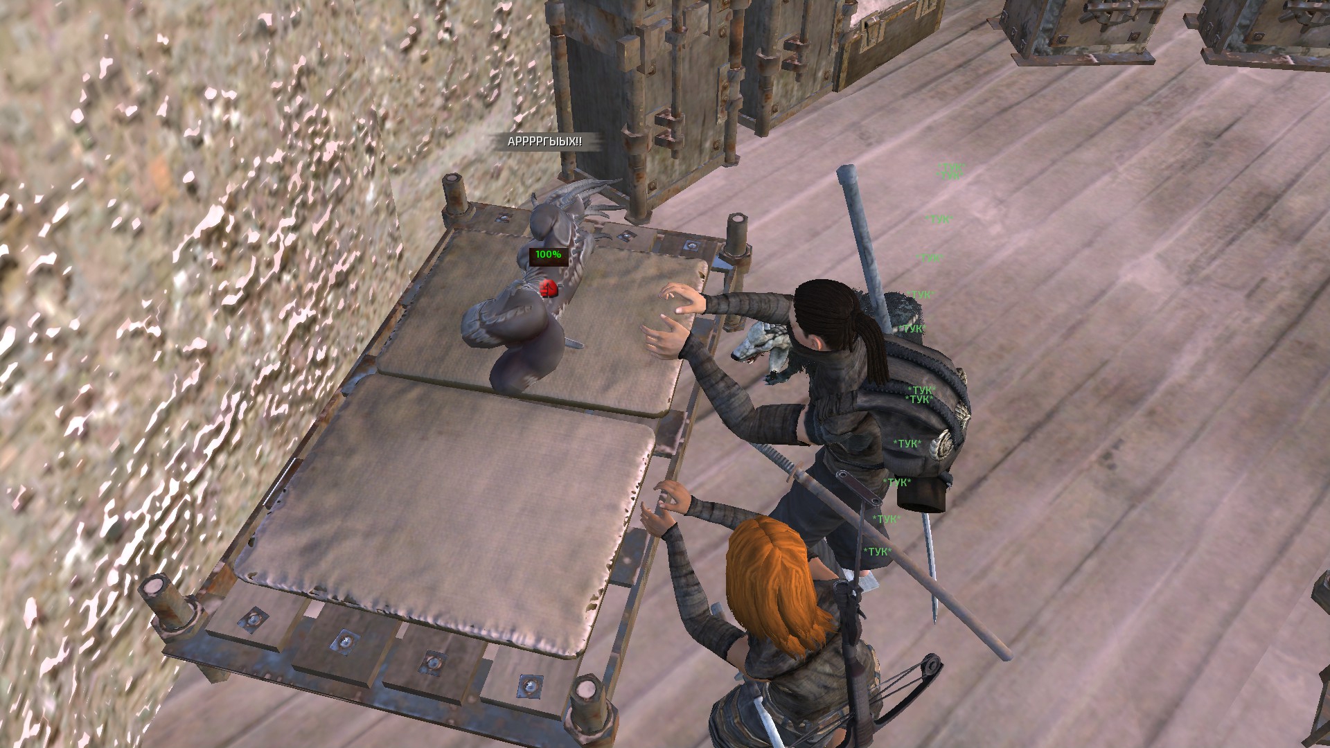 Барк вновь "показал зубы". При попытке повторно ограбить строительный магазин Щенка не просто застукали, а повесили на неё награду к.2500 и срок аж 99 часов. Напомню, строительный принадлежит машинистам, а у наших окраниток с ними вражда; из всех около-технологических только с техохотниками нейтральные отношения. Подхватив какого-то истерзанного рвачами и Демоном бедолагу (пик1: знатный поток кровищи из откушенных ног), девушки двинулись в путь. Они окончательно решили, что с песками им не по пути, так что направились на юг. Но всё же завернули в Хенг, потому что там была будка скелета-протезника. Вообще, после недавней резни в Грузе самураи, похоже, решили устроить облавы на шиноби (эх, а как из главарь рассказывал, что всех не пересажают! Пересажали...) и здешнюю башню тоже полностью зачистили. Но нет худа без добра - сёстрам досталась целая башня в безвозмездное пользование. А будка исчадия Нарко - в двух шагах от башни. Однако достаточно скоро стало понятно, отчего умер предыдущий скелет. Пик2. Он просто не пользовался ремкроватью. Этого решено было пощадить, пригодится на будущее. К тому же появилось новое развлечение. В башню забрела женщина с протезом ноги. Щенок не выдержала такого скелетного вторжения и вырубила её. Отнесла на третий этаж и стала отрабатывать тихий нокаут. Сначала всё двигалось довольно медленно: горожанка просыпалась, ползла к лестнице, окранитка её нокаутировала, потом ждала, пока та проснётся. Потом вернулась Лулина с Демоном на руках, и вместе они обнаружили вот что: почувствовав целебный "кусь", скелетесса мгновенно просыпается, так что можно сразу её нокаутировать ещё раз. Оставив сестру тренироваться, Щенок спустилась встретить другую гостью, и о святой Лорд Феникс! Это была шекская техохотница. Рогатых зверей мы пиздим. Навыка убийства едва-едва хватило, чтобы нокаутировать и раздеть незванную гостью. А это значит, что тренироваться на ней будет гораздо эффективнее, чем на неженке-горожанке. Демону скомандовали "фас", и он успешно отгрыз шечке ногу. Дальше её перевязали и уложили в кровать, и тут родилась гениальная идея. Итак. Пик3 (хотя это в таком виде было чуть позже, но для иллюстрации подойдёт). Способ быстрой прокачки убийства при помощи мода Feed Them To The Dogs. 1. Кладём одногую жертву в кровать. 2. Спускаем собаку. Жертва начинает орать - значит не спит. 3. Делаем "тихий нокаут". Заносим руку над пробелом. 4. Как только появляется ТУК, ставим игру на паузу. 5. Прожимаем ещё раз "тихий нокаут". Быстро-быстро дважды нажимаем пробел. 6а. Если появился ещё один ТУК - повторяем п.5 6б. Если произошла НЕУДАЧА - поднимаем жертву и снова кладём в кровать. Это она сбежать попыталась. 6в. Если ничего не произошло - значит началась новая анимация нокаута. Возвращаемся к п.4. С каждым ТУК начисляется немножко экспы, а повторять его можно до тех пор, пока анимация удара не доиграет до конца. Примерно до 75 шли по очереди, потому что вдвоём слишком высокий шанс, что у кого-то не прокнет, и придётся тратить время на возврат шечки в кровать. А дальше уже стали тукать вдвоём одновременно и дошли до 90 раньше, чем Демон доел последнюю руку техохотницы. Дальше уже прокачка совсем медленная, меньше 1% за ТУК дают. Это надо на каких-нибудь Несокрушимых качать.