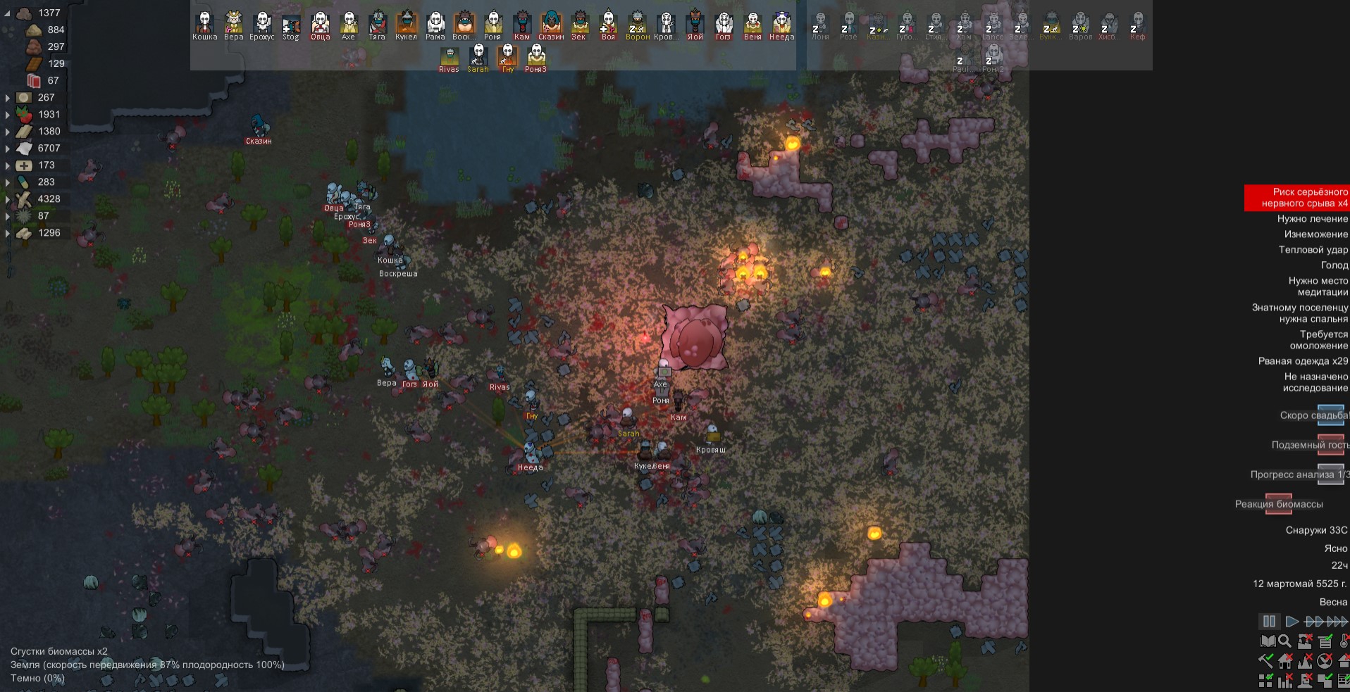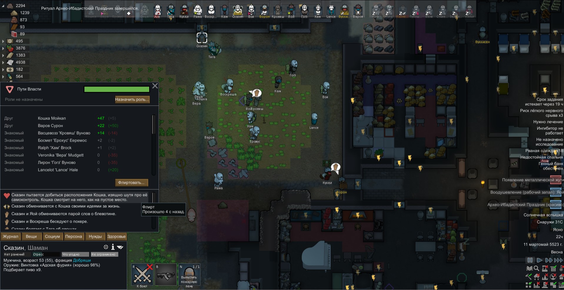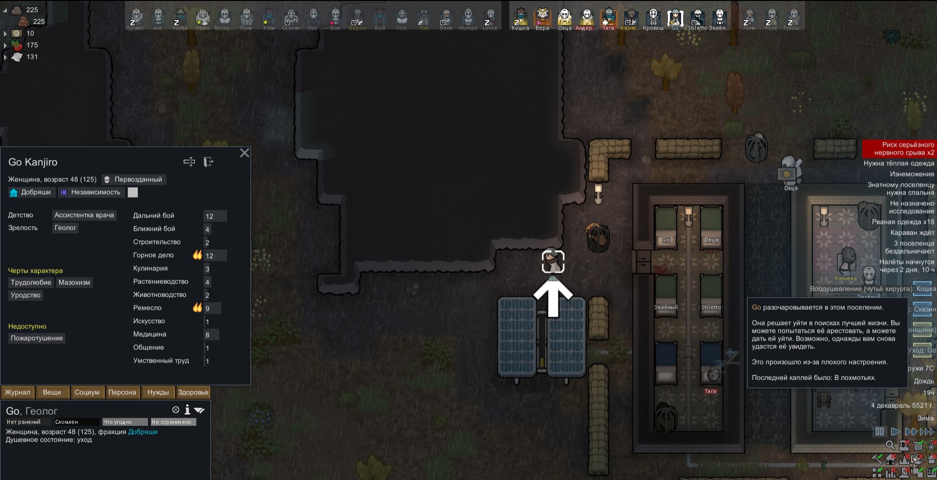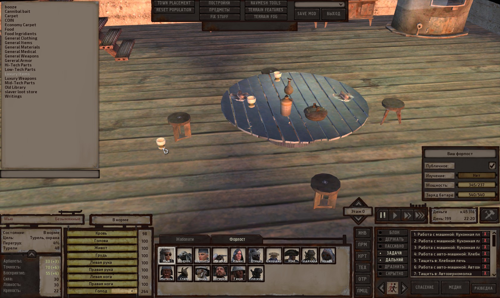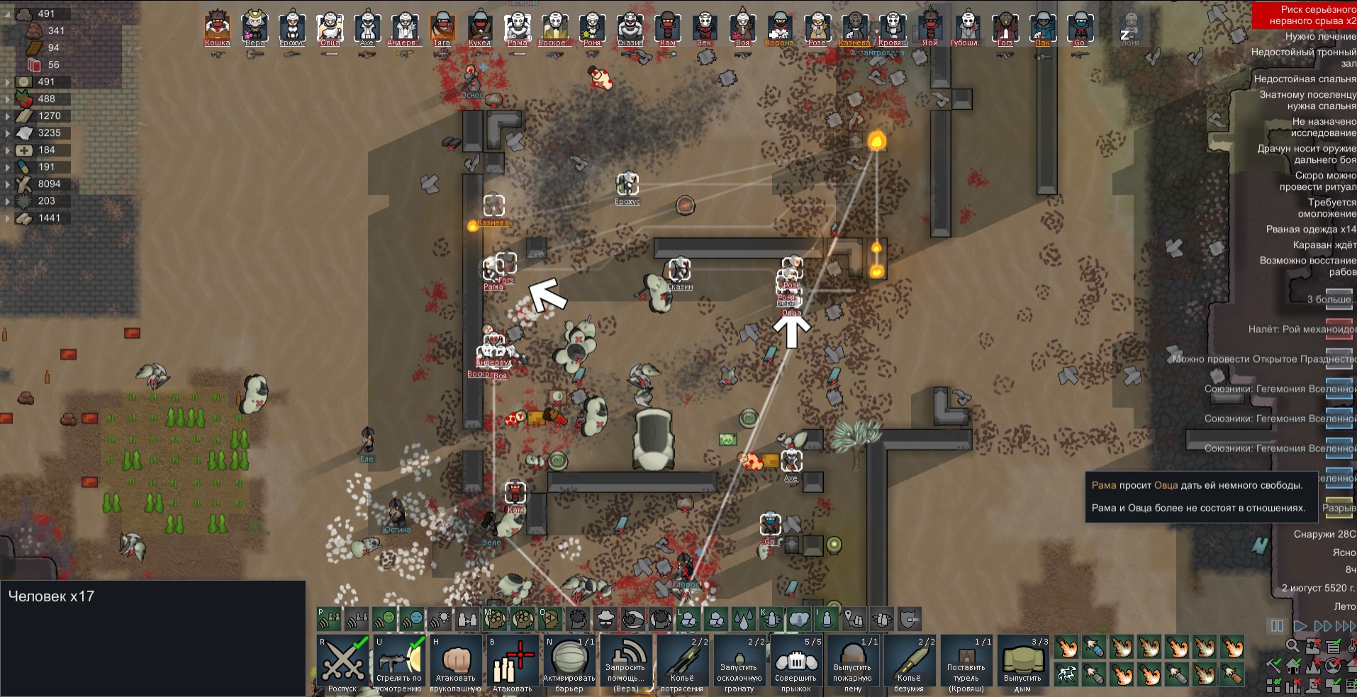 Начал дюжиной свежих бомжей с 20-30 в боевых навыках базу в Шеме, почти сразу пришёл отряд ниндзя, я решил не убегать толпой, а отослать одного доходягу в сник в кусты, остальных послать стенкой, Toughness сама же не поднимется. В итоге моих бомжей предсказуемо раскатали, но теперь рейдеры остались, сенобургер им поперёк глоток, в моём аутпосте с работой Patrolling a town, мой доходяга с бинтами в руках не может подрасться обратно, а мои все Playing dead, кровотечение остановилось со временем, а раны ухудшаются до критических с каждым часом. И чо делать-то?? Вставать разом и в рассыпную надеясь что хоть кто-то сможет убежать? Чего рейдеры не уходят, я согласен даже если меня обкрадут до нитки и обоссут, лишь бы не вайп сквада.