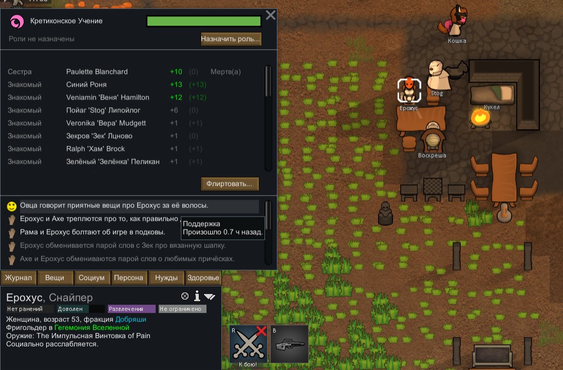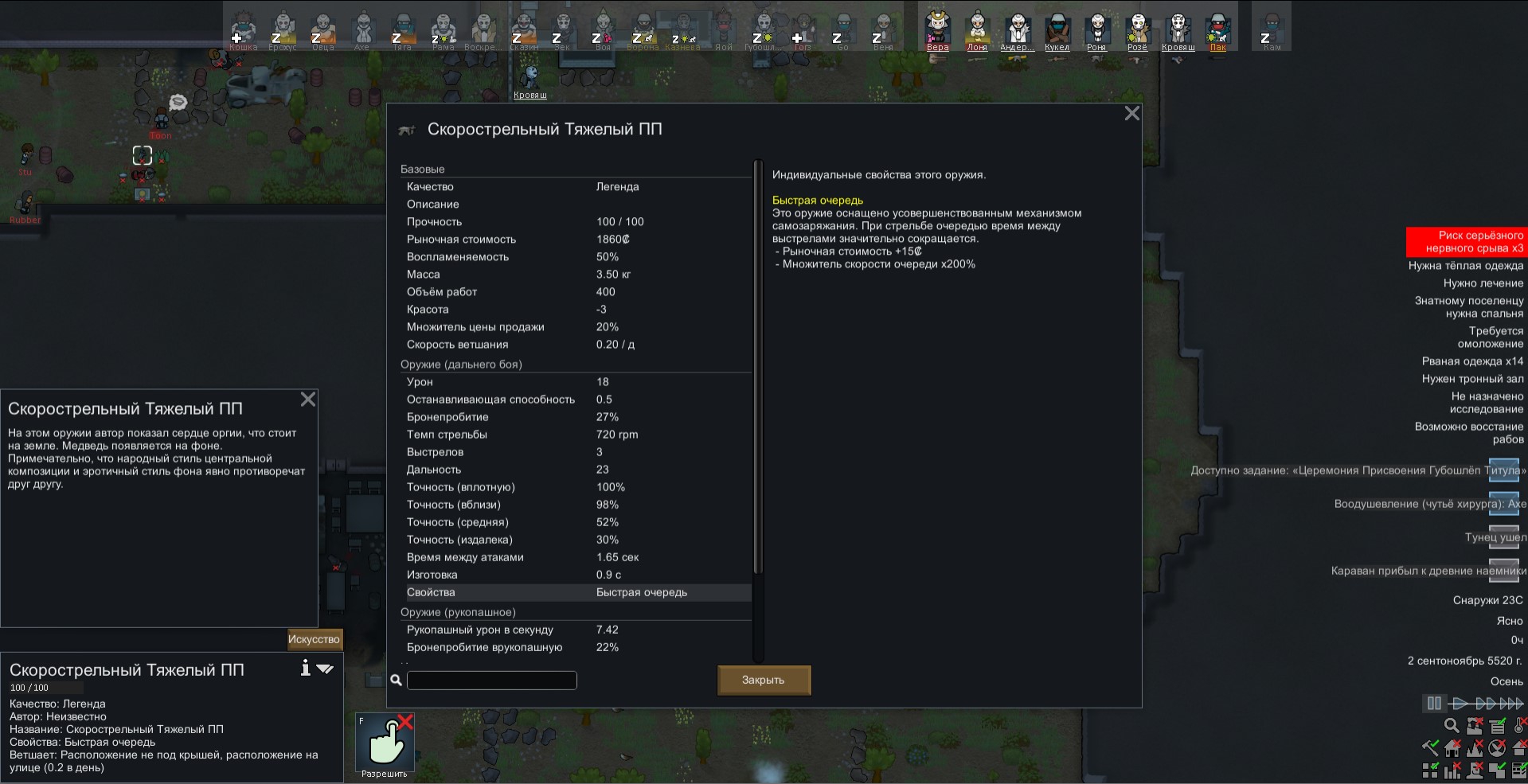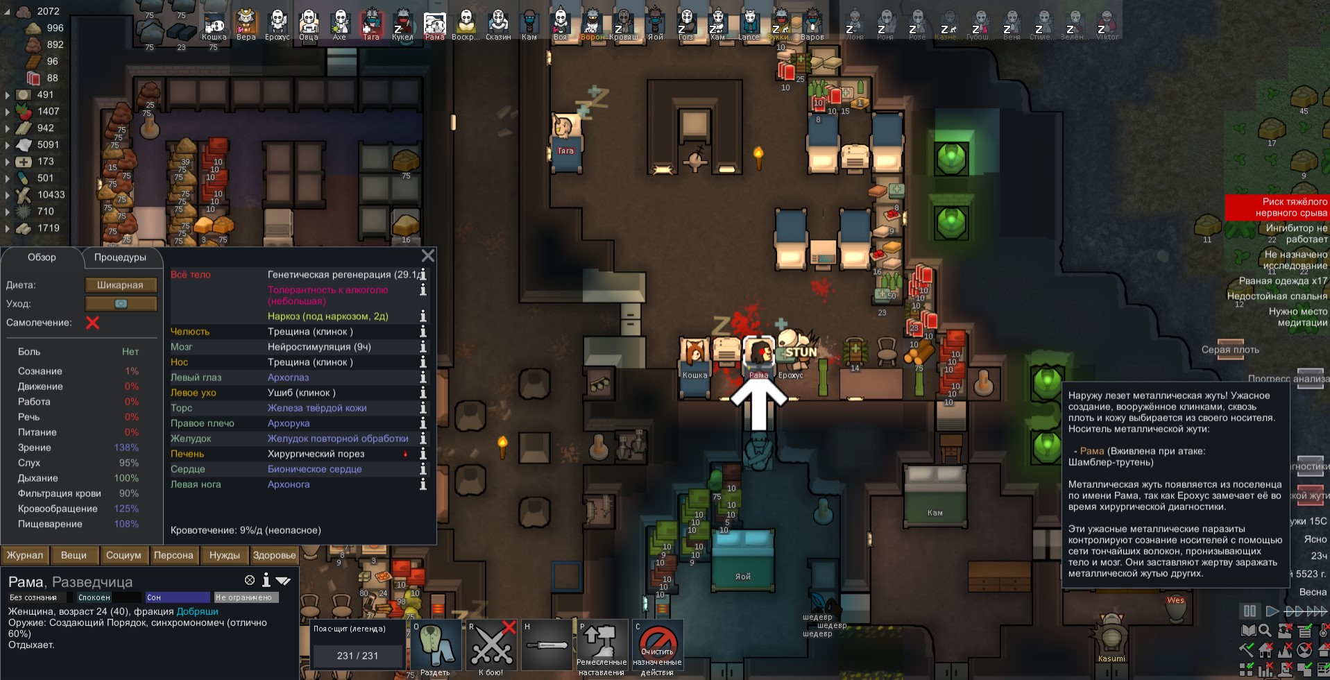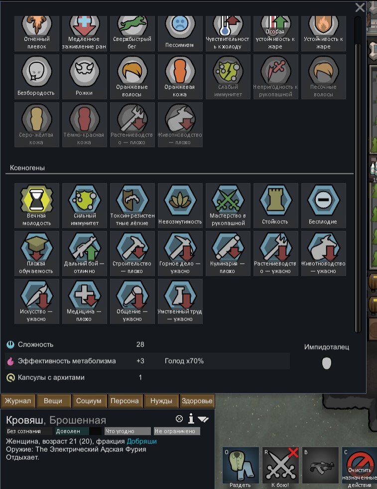 Единственное но: выбери между Compact Hediffs и Nice Health Tab. Они не конфликтуют, но Nice health Tab сделает свою отключаемую закладку для отображения здоровья, так что ты всё равно не сможешь пользоваться и тем и другим одновременно. Я держу оба, потому что некоторые вещи для меня удобней смотреть в Compact Hediffs, например болезни.